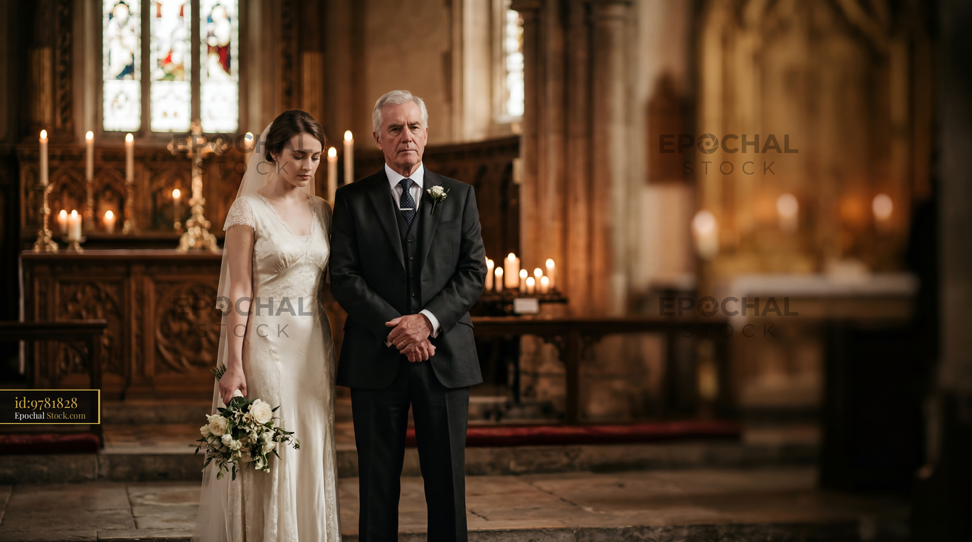 A daughter stands beside her father in a church. They are in formal clothing. Candles are lit in the background. The atmosphere shows an important moment in the wedding ceremony.