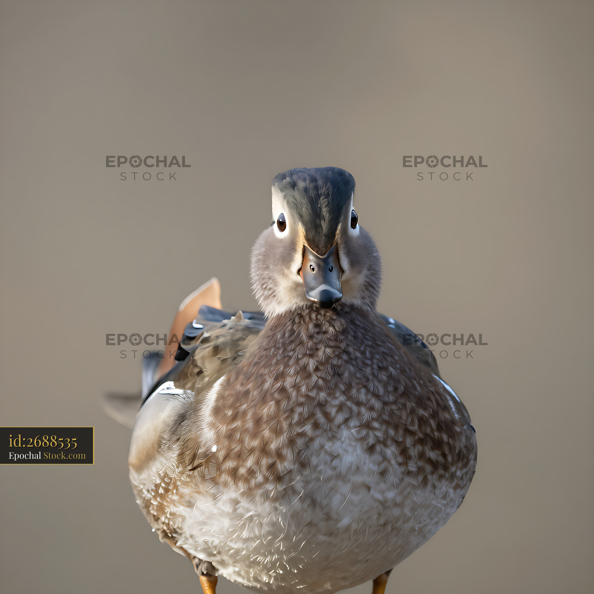 A detailed front-facing portrait of a female mandarin duck, showcasing its intricate plumage and curious expression against a neutral, blurred background, evoking a sense of calm in nature.