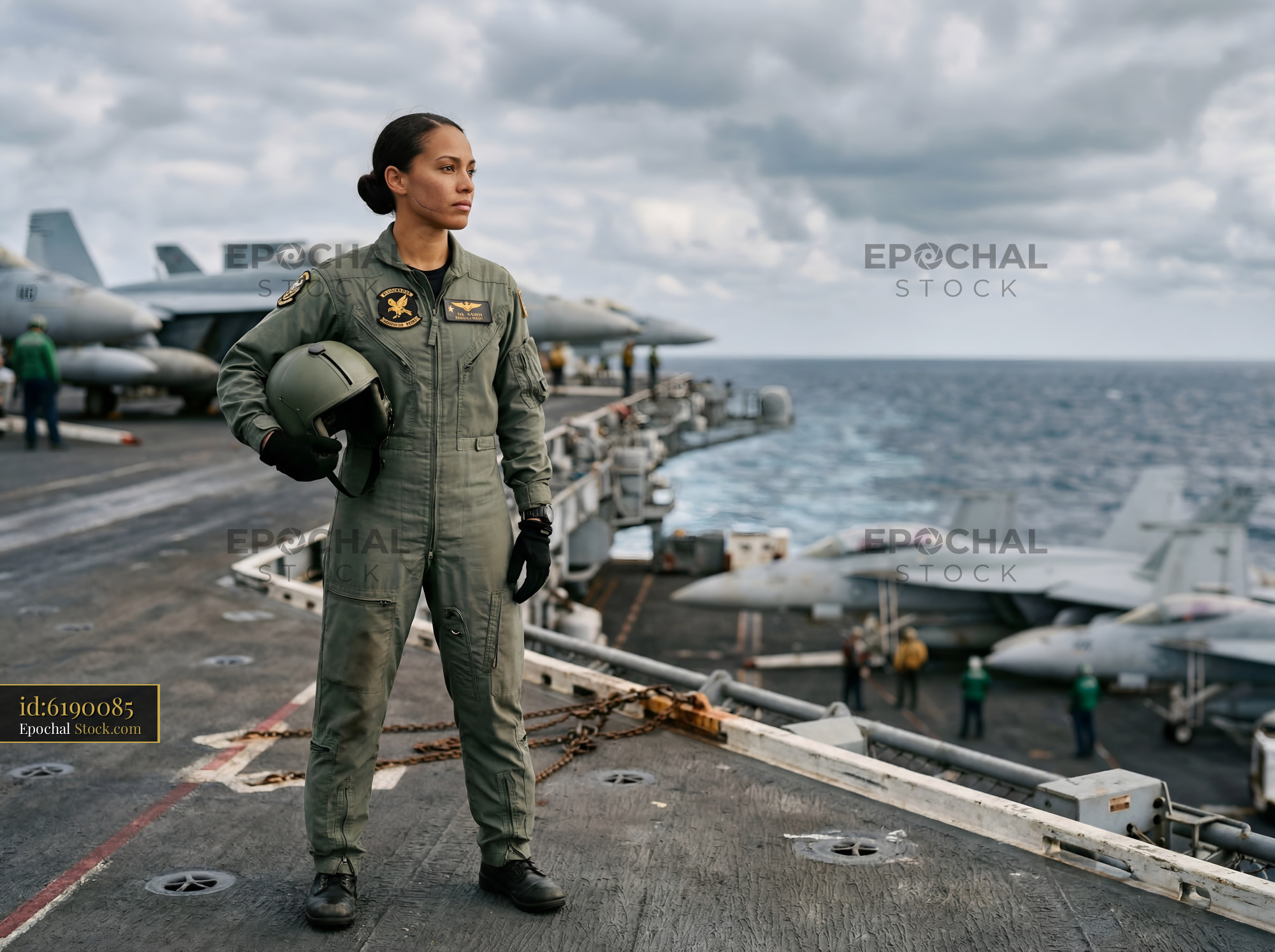 A female pilot stands on the deck of an aircraft carrier. She holds a helmet and looks out at the ocean. Military jets are parked in the background. The scene shows a training mission in action.