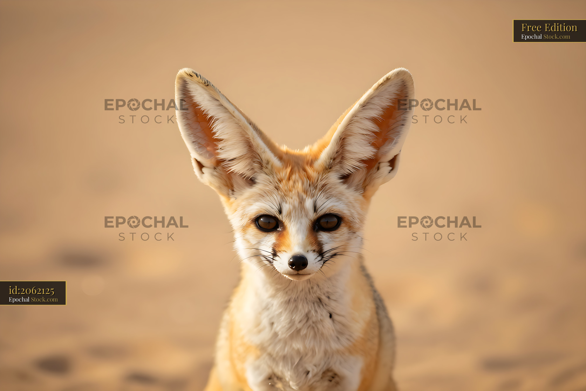 A close-up portrait of a fennec fox with distinctive large ears, standing in the vast sand dunes of the desert, capturing the essence of wildlife, curiosity, and adaptation in arid environments.