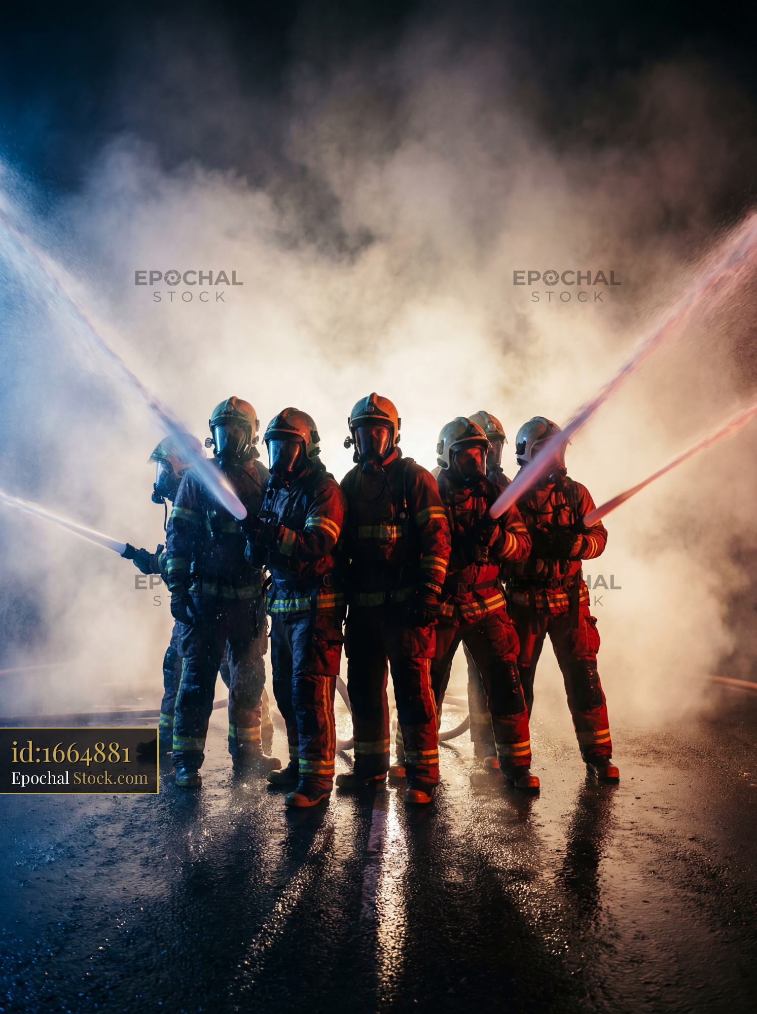 Firefighters gather on a wet street at night. They hold hoses and prepare for action. Smoke surrounds them while they aim water with focused expressions.