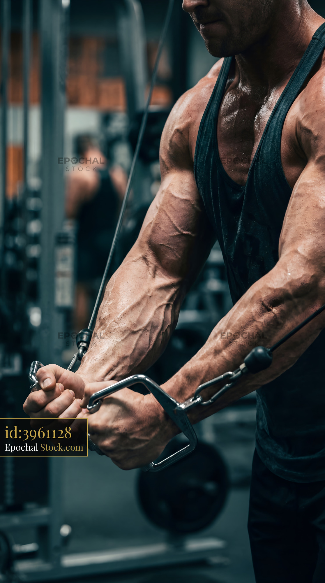 A man is using a cable machine to perform an exercise for his arms. He focuses on his form while lifting weights in a busy gym setting during the day.