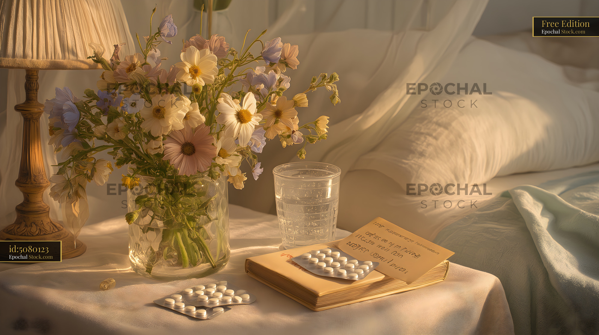 A vase with flowers sits on a bedside table next to a glass of water and a book. Pill packets rest beside the book, adding to the quiet scene in the room.