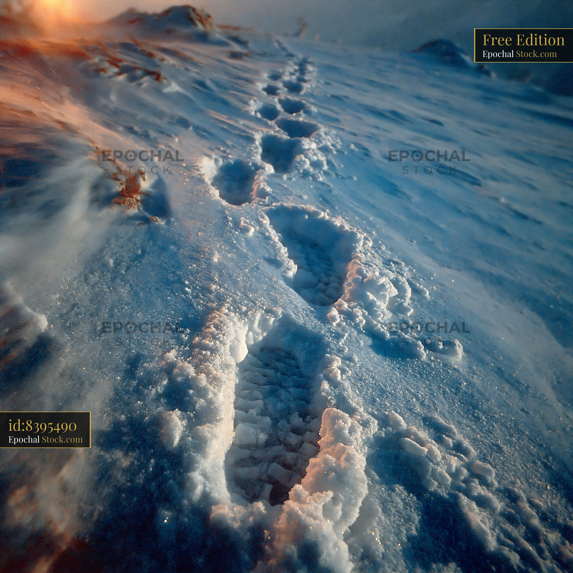 Deep boot prints trail across a frozen snowy landscape, catching the warm glow of the setting sun, symbolizing a lonely journey, exploration, and the path forward through winter wilderness.