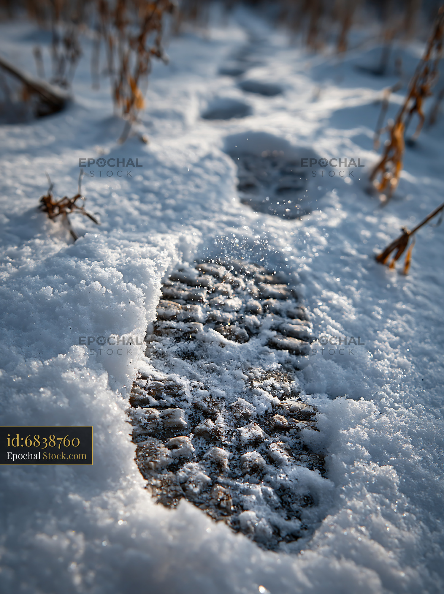 Deep boot prints mark a path through fresh powder snow in a quiet winter landscape, evoking themes of exploration, solitude, and new beginnings.