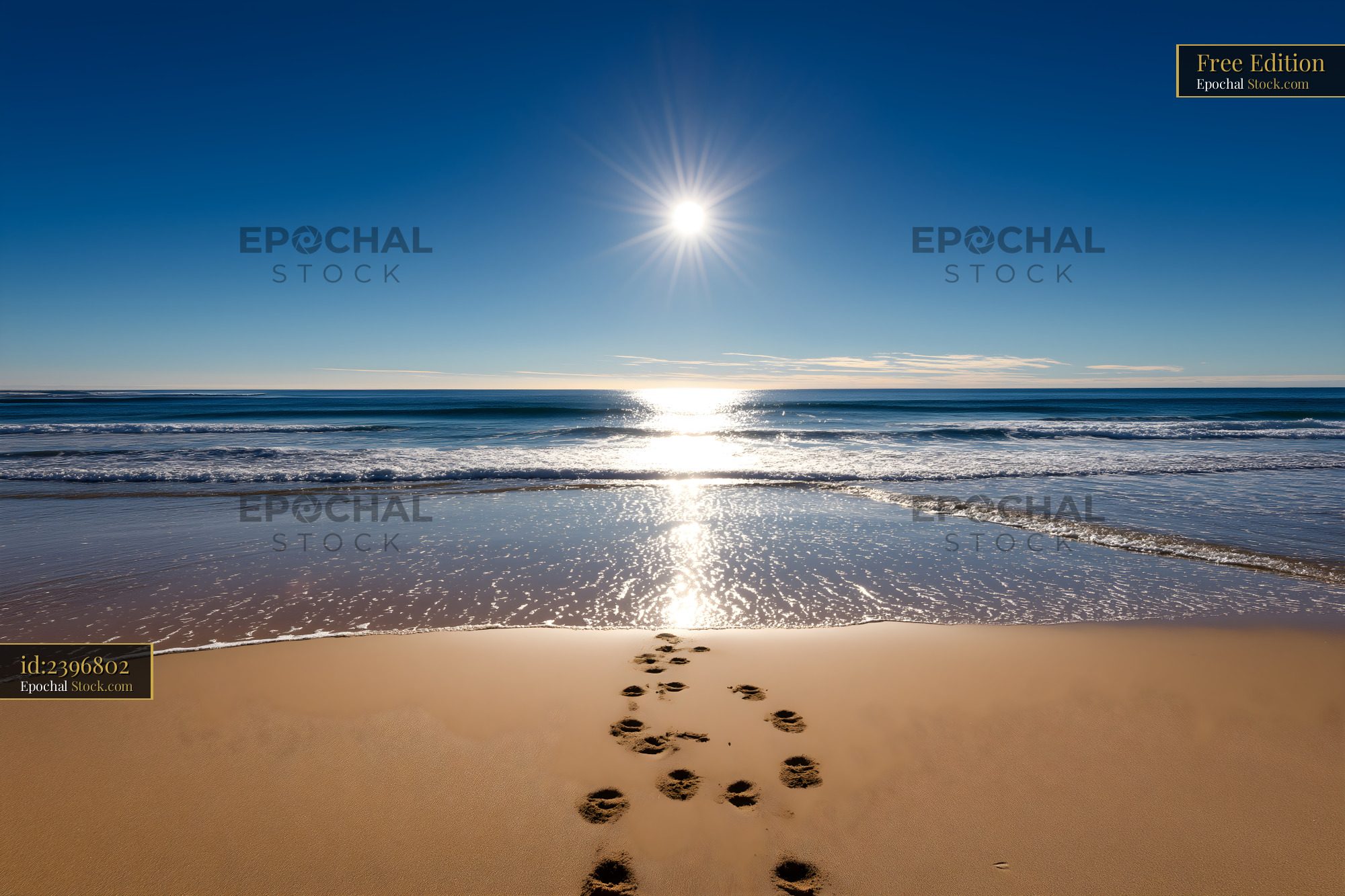 Footprints lead to the ocean under a bright sun Free Premium Stock Image