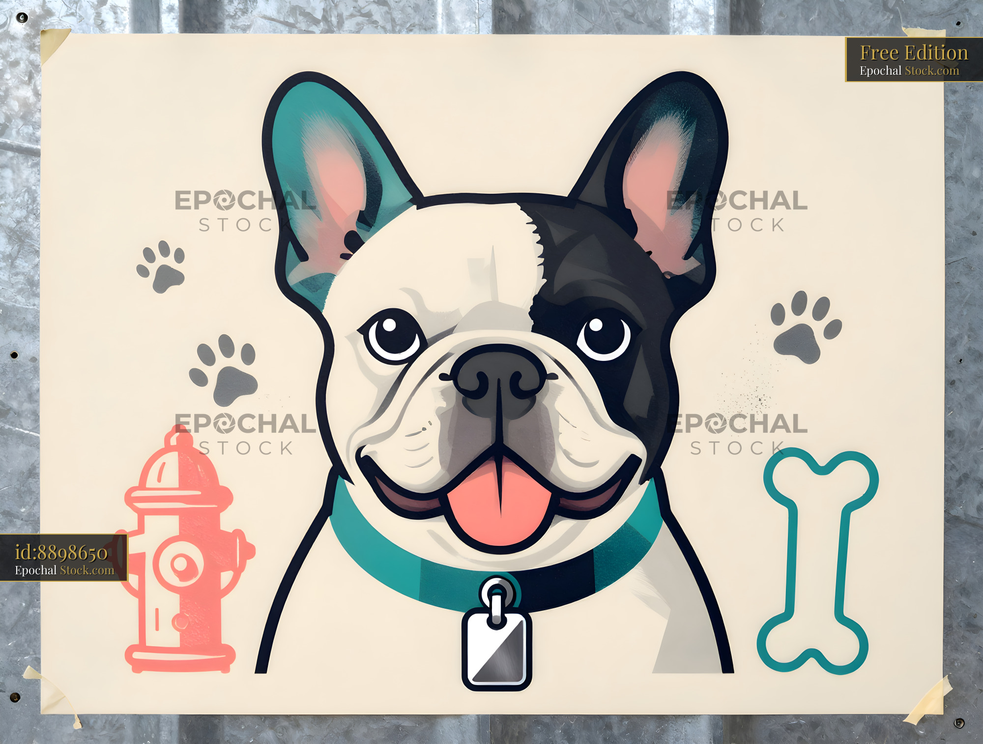 A picture of a French bulldog is displayed on a wall. Next to the dog are a fire hydrant and a bone. The artwork shows the dog's face with a friendly expression.