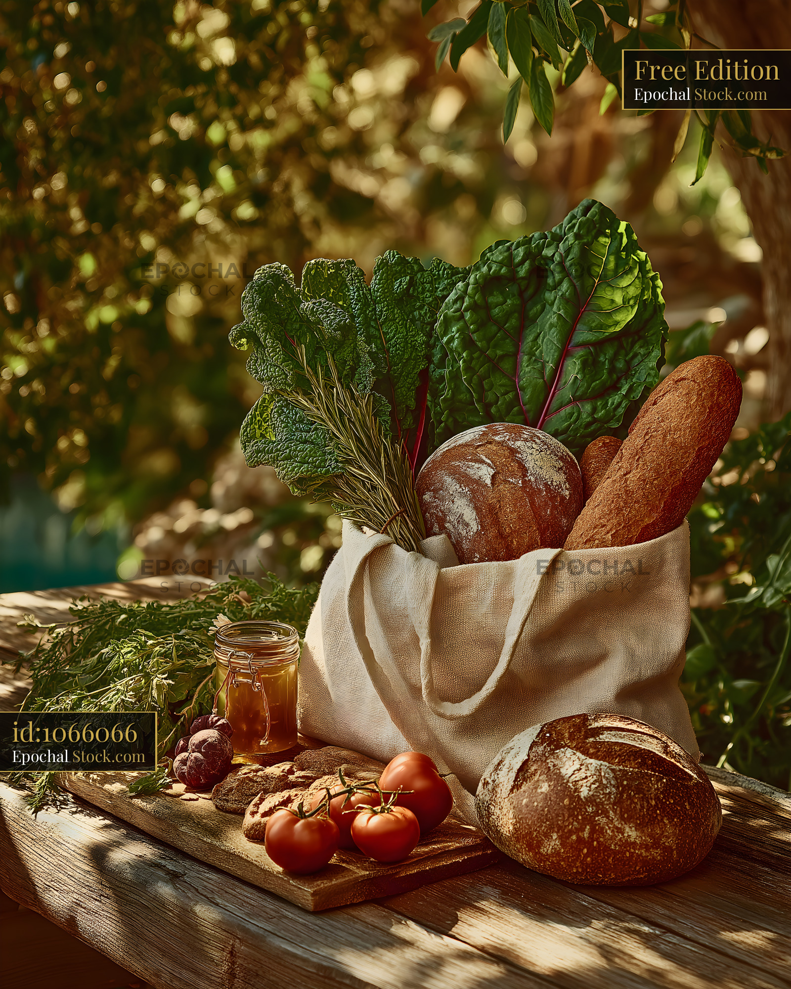A bag holds fresh bread and greens on a wooden table. Nearby, tomatoes and a jar are arranged among the herbs. The setting is bright and cozy with natural lighting.