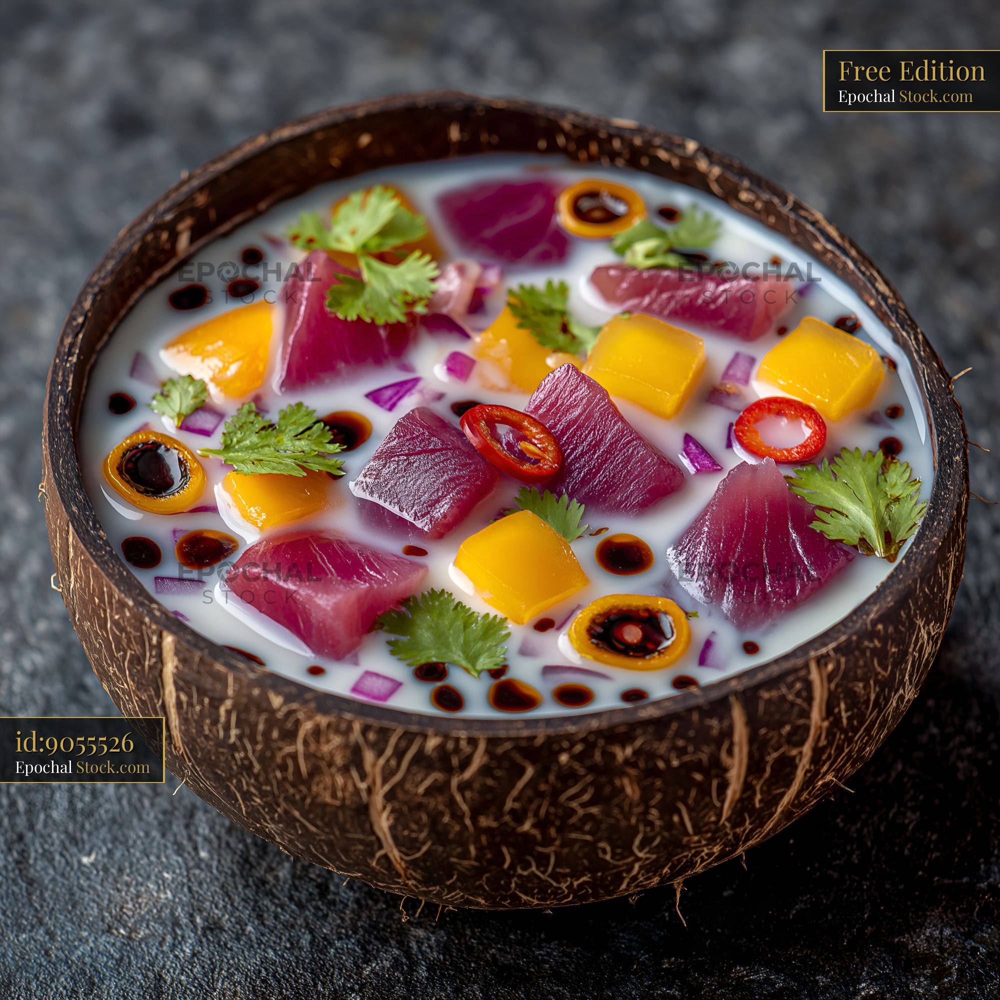 Fresh fish dish served in coconut bowl with colorful toppings Free Premium Stock Photo