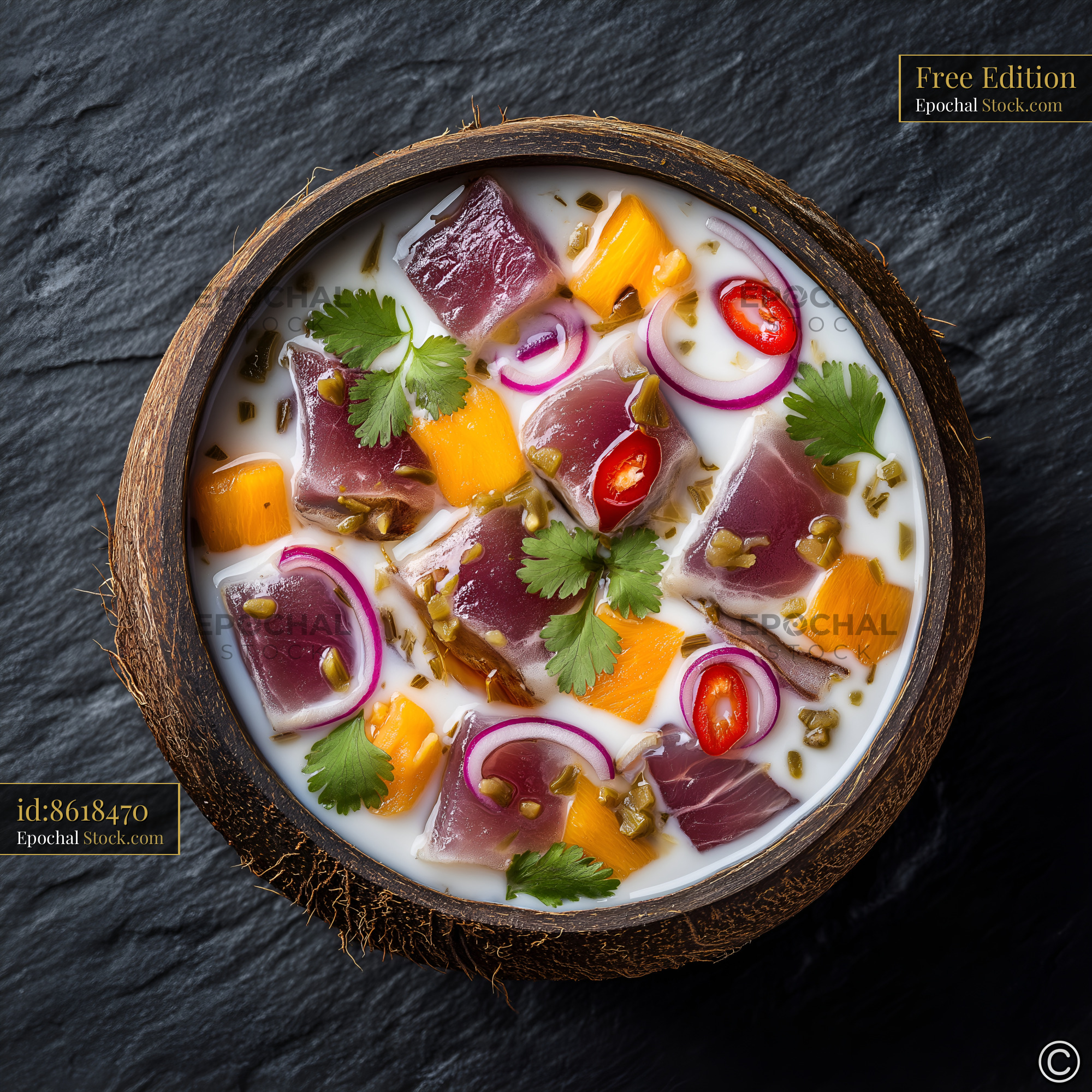 Fresh fish salad with tropical fruits in a bowl Free Premium Stock Image