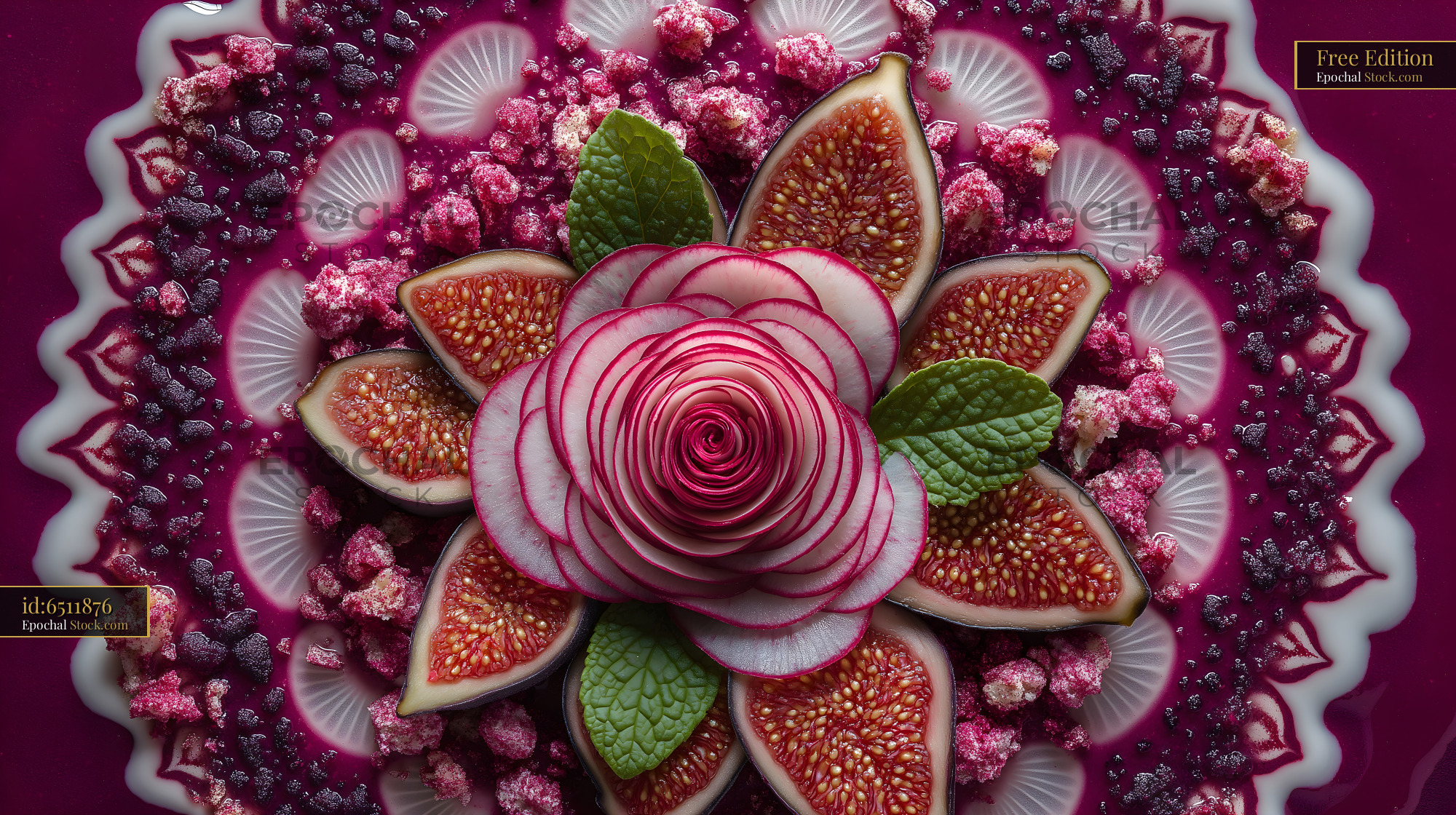 A variety of fruits including figs and radishes are arranged on a plate. A flower made of radish sits in the center. The colors create a bright display, showing careful design and creativity.