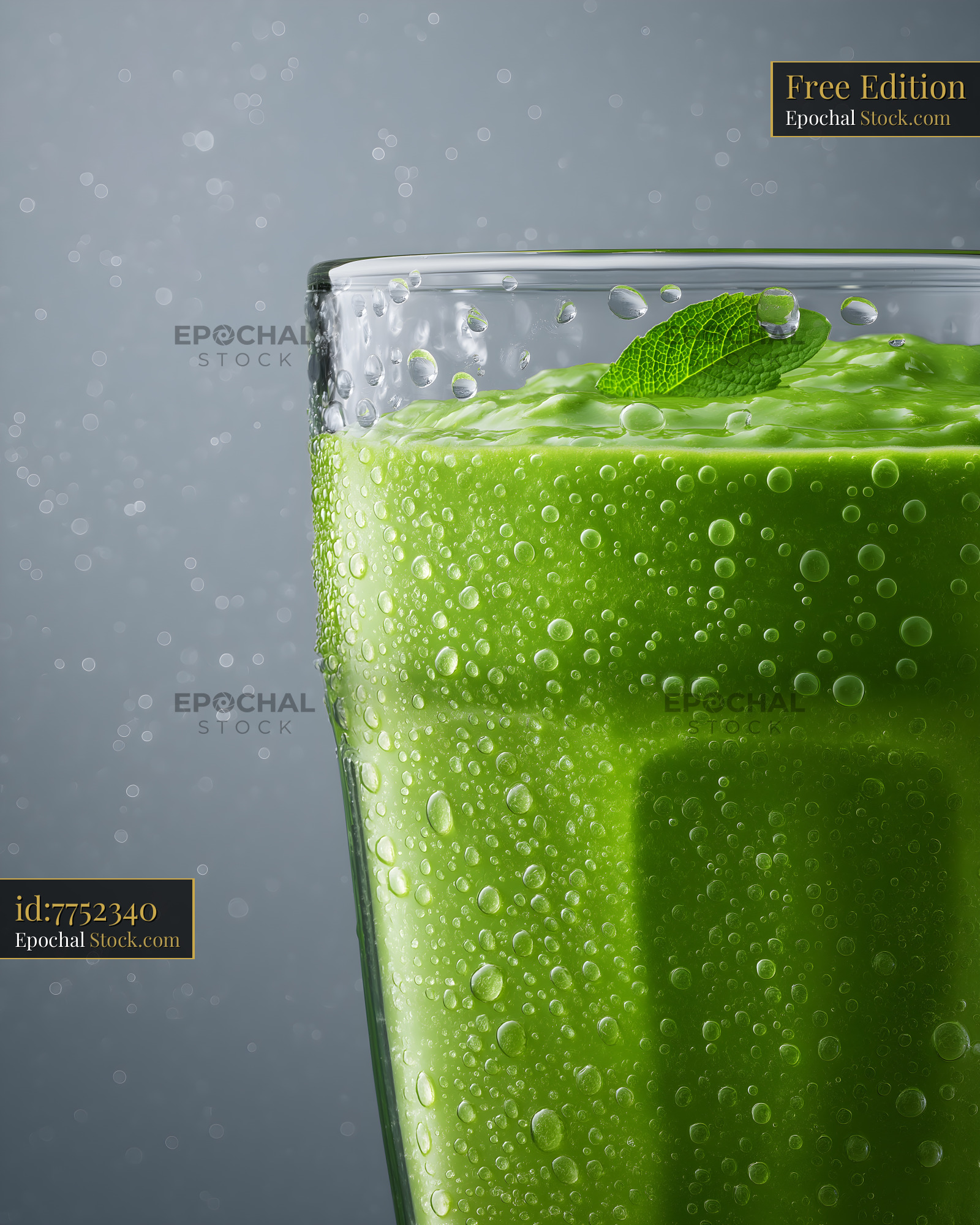 A bright green smoothie is in a clear glass. The glass has water droplets on the surface. A fresh mint leaf sits on top of the smoothie. The background is soft and gray.