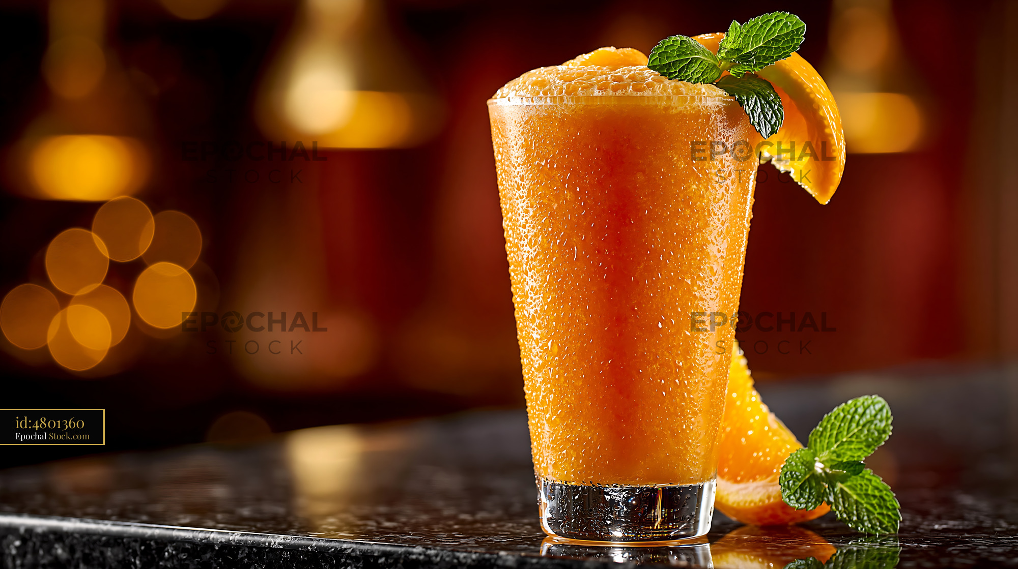 A refreshing hallabong citrus smoothie garnished with fresh mint and orange slices sits on a dark marble bar, evoking a sense of premium summer relaxation and tropical flavor.