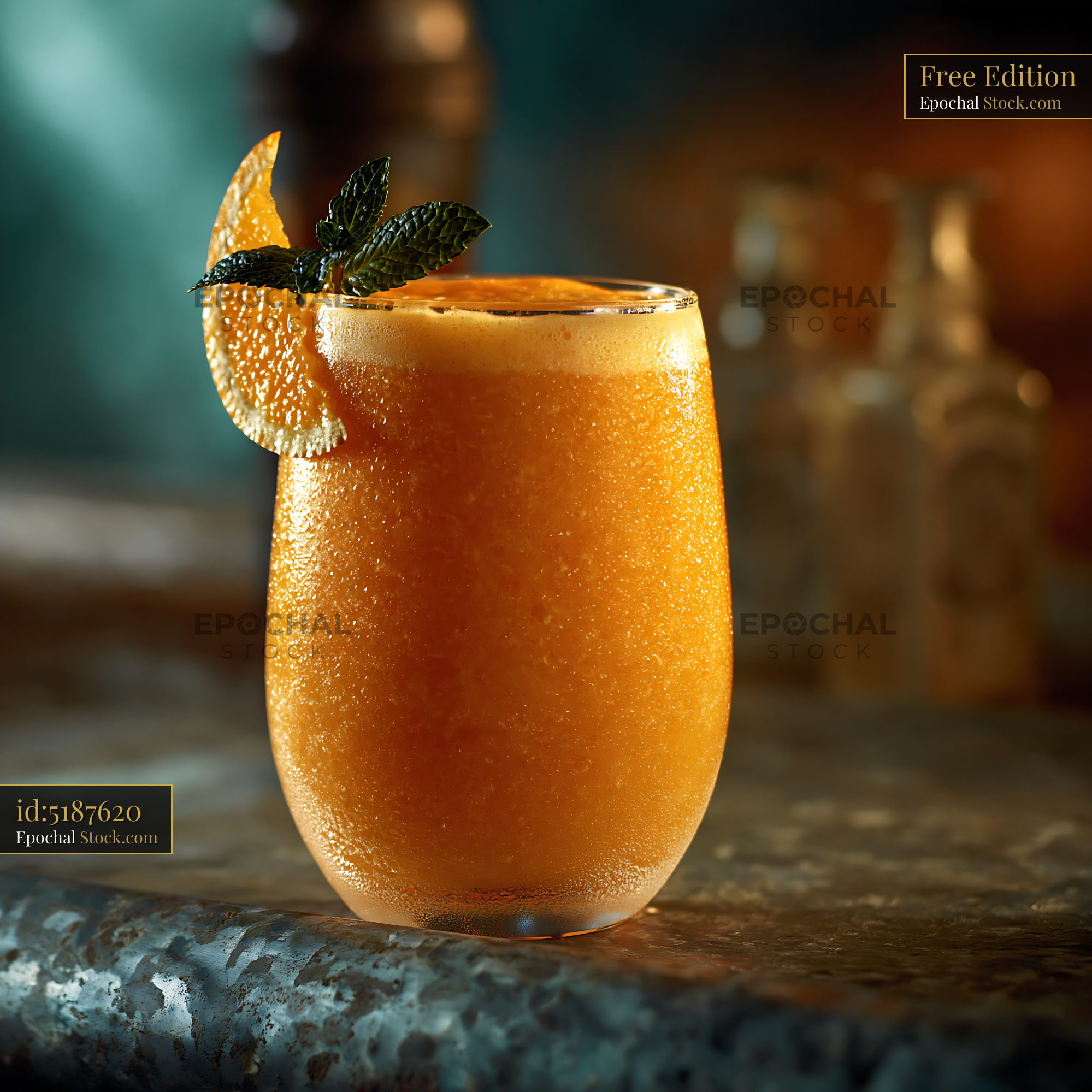 A refreshing hallabong citrus smoothie served in a chilled glass, capturing the vibrant taste of Jeju Island and a healthy summer lifestyle in a rustic bar setting.