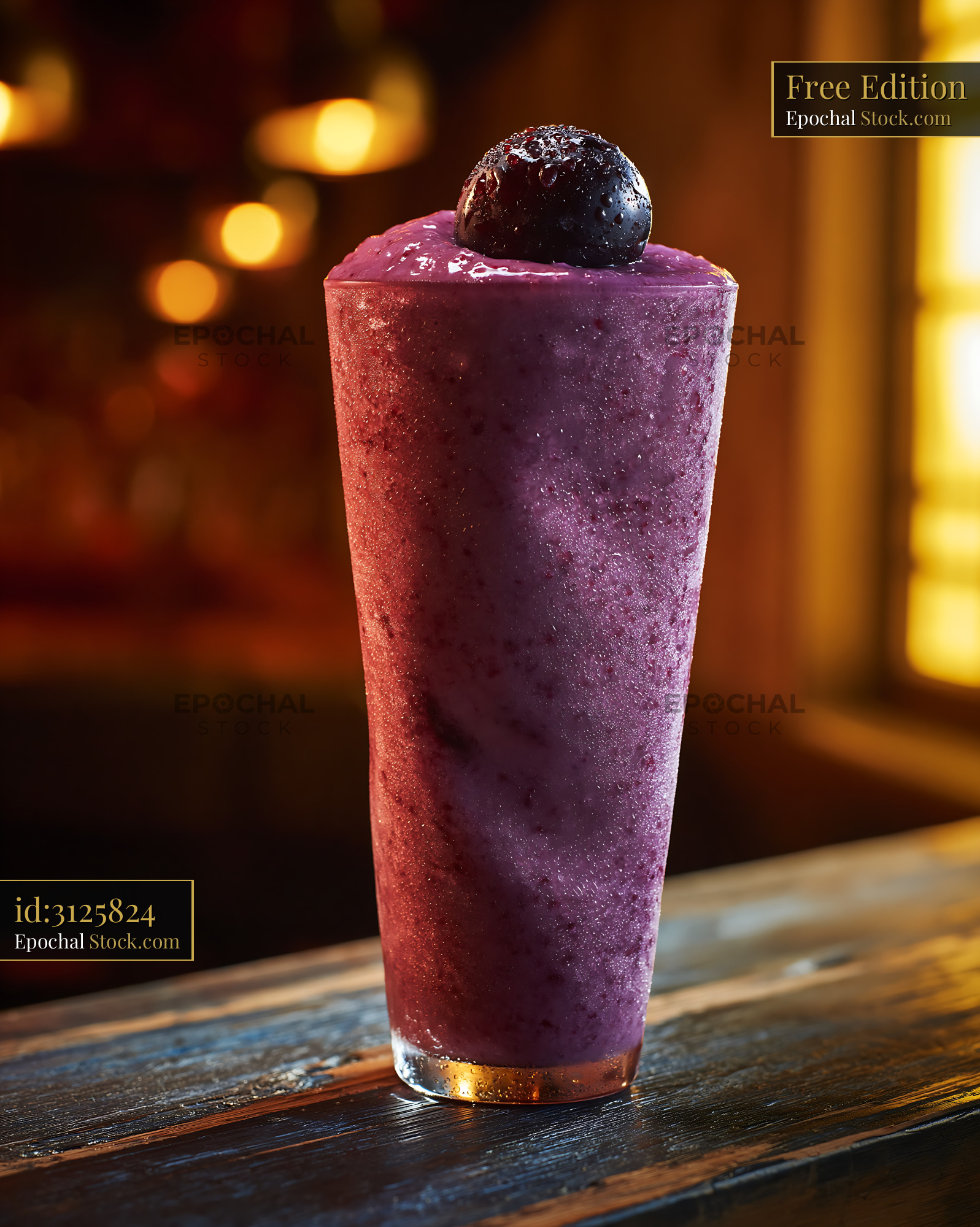 A vibrant purple Kyoho grape smoothie topped with a fresh grape on a rustic wooden bar, illuminated by warm bokeh lights, evoking a sense of luxury and seasonal refreshment.