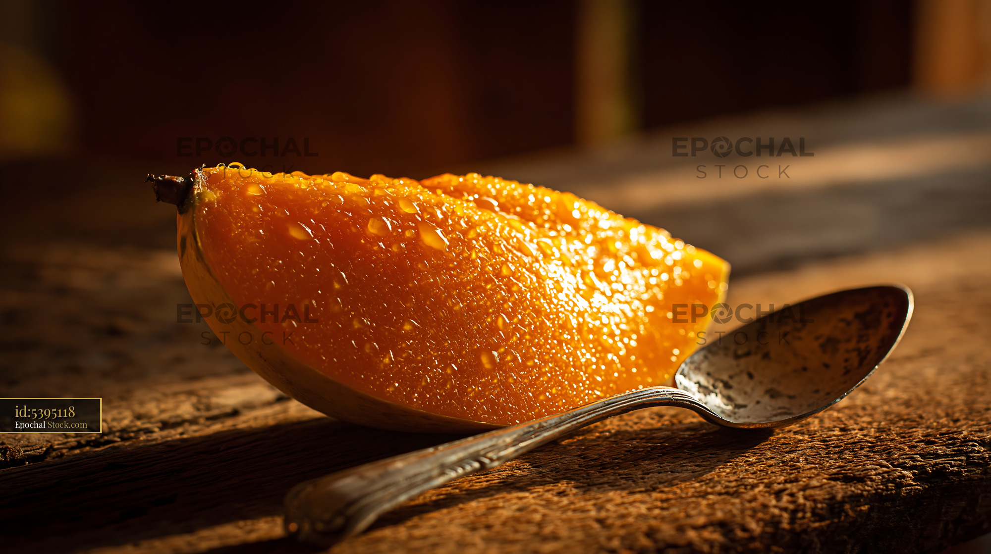 A juicy slice of ripe mango with fresh water droplets sits next to a vintage spoon on a weathered wooden surface, bathed in warm golden sunlight evoking a sense of organic freshness.