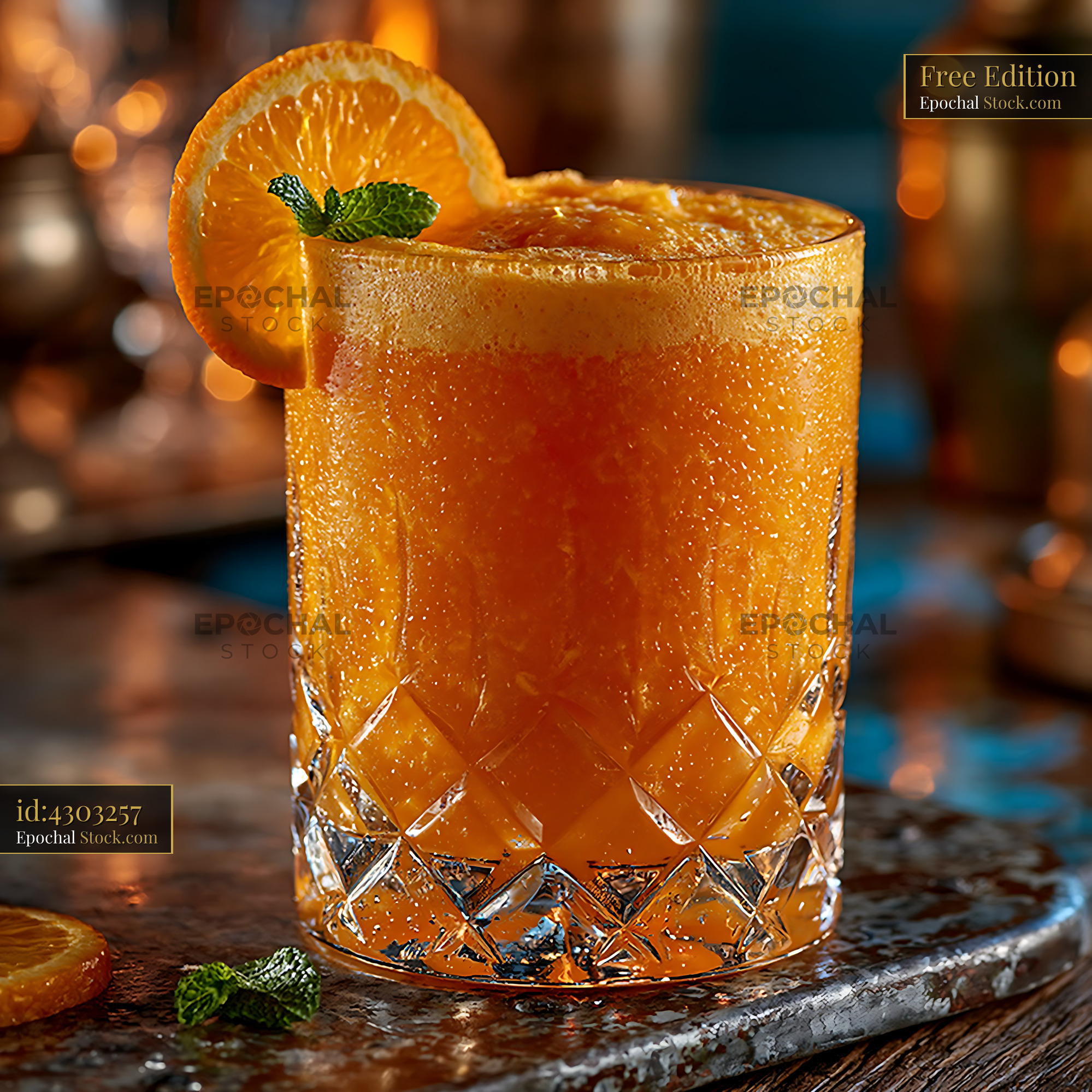 A vibrant mikan orange smoothie in a crystal glass, garnished with fresh mint and citrus, evoking a sense of tropical refreshment and healthy luxury in a warm bar setting.