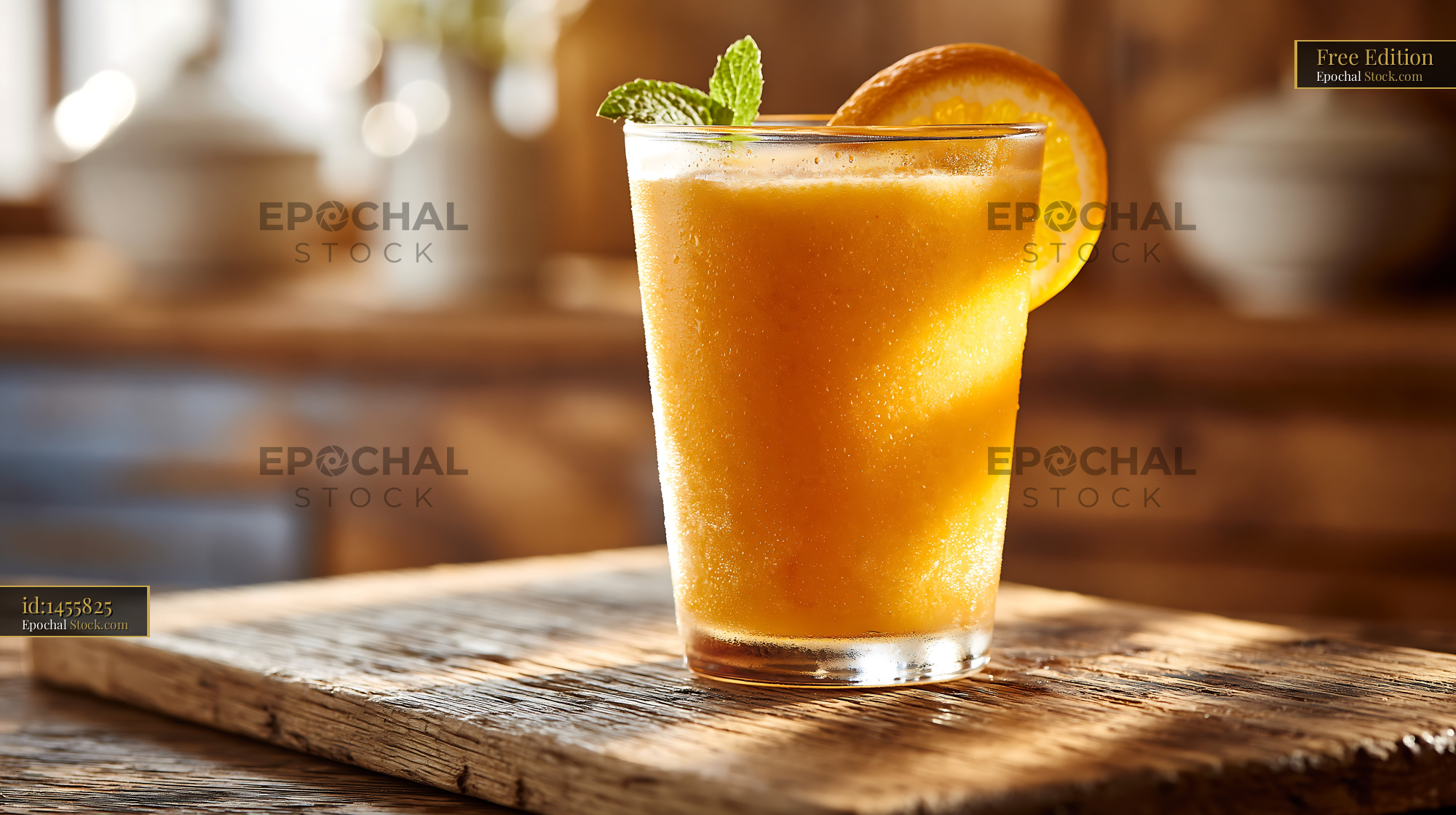 A chilled mikan orange smoothie garnished with mint and a citrus slice sits on a weathered wooden table, illuminated by warm morning sunlight, evoking a healthy and refreshing lifestyle.