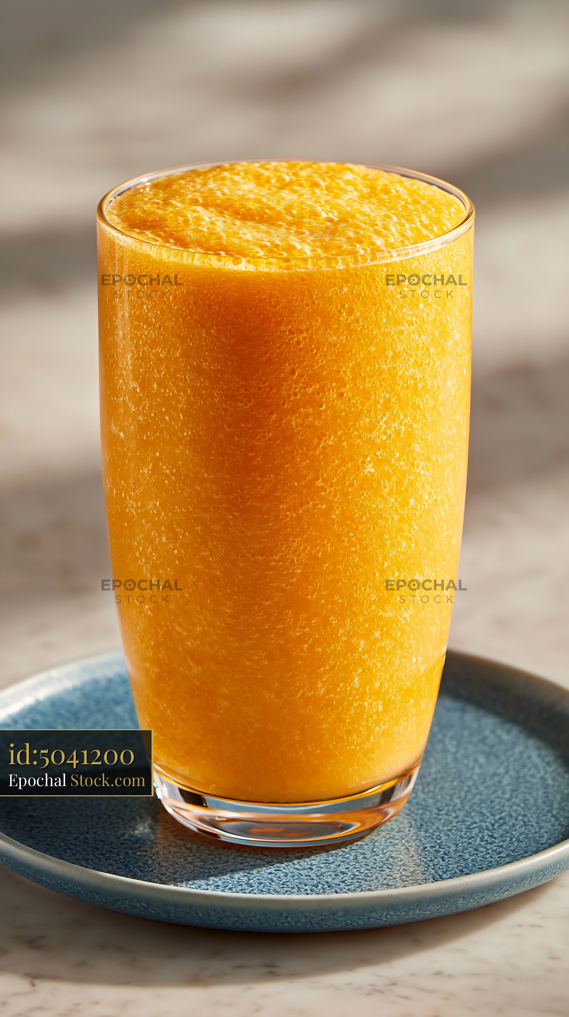 A refreshing pawpaw punch milkshake served in a tall glass on a textured blue plate. The vibrant orange drink captures a sense of tropical indulgence and healthy summer refreshment.