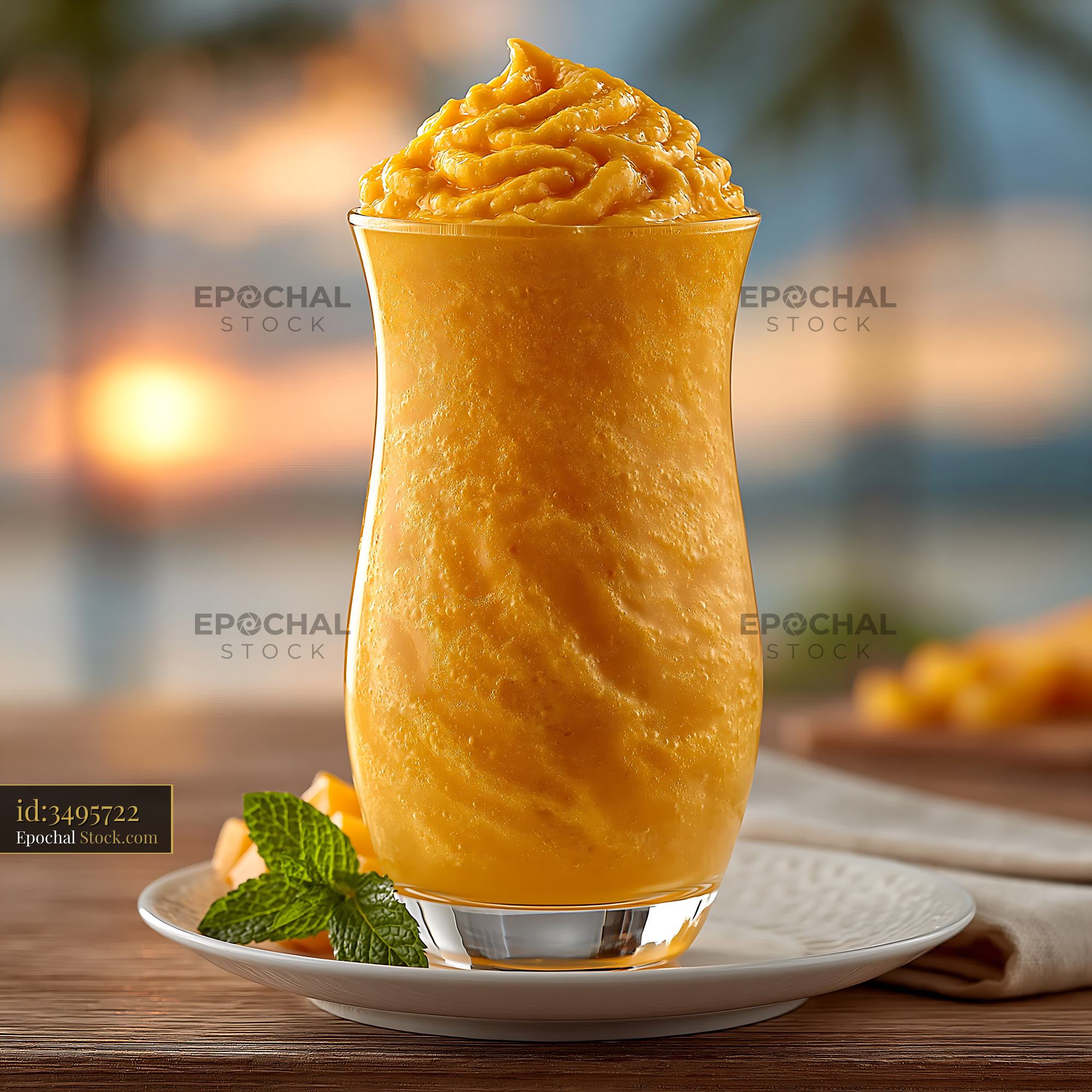 A refreshing pawpaw punch milkshake served in a tall glass, garnished with fresh mint on a wooden table, evoking a tropical vacation mood with a warm sunset background.