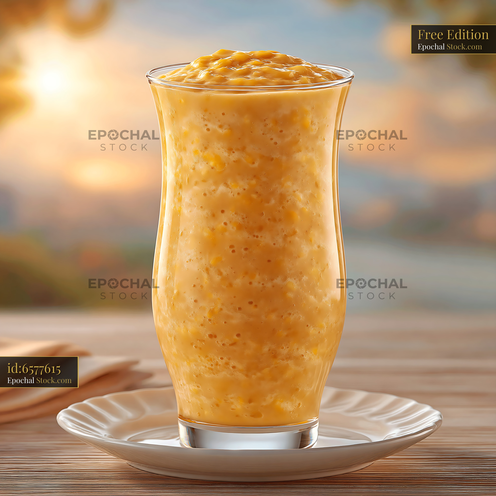 A refreshing glass of creamy pawpaw punch milkshake sits on a saucer, capturing the warm glow of a setting sun to evoke feelings of relaxation, summer indulgence, and tropical refreshment.