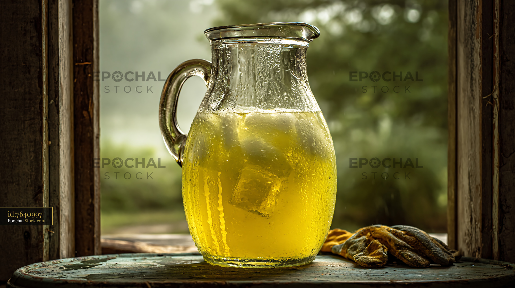 A condensation-covered glass pitcher of cold lemonade with ice sits on a rustic ledge, offering a refreshing moment with a luxury hotel balcony view of a lush garden.