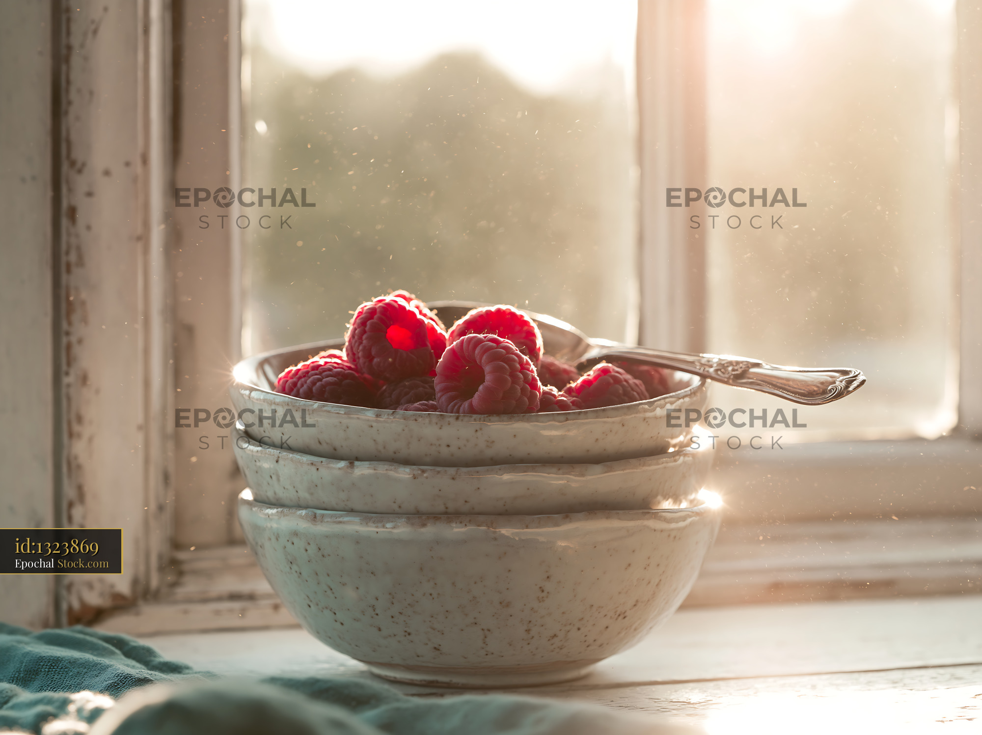 A stack of rustic ceramic bowls filled with fresh raspberries sits on a windowsill, illuminated by warm, soft golden hour sunlight, evoking a sense of peaceful morning rituals and simple living.