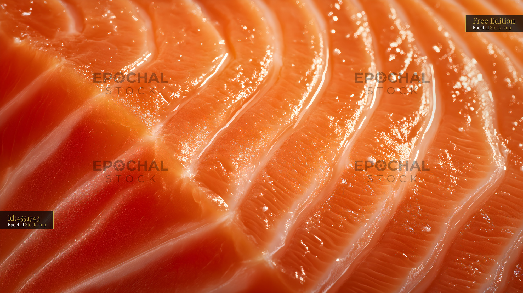 Close view of a fresh salmon fillet showing its natural color and texture. The fillet has clear lines and a shiny surface, indicating freshness. Perfect for various dishes.