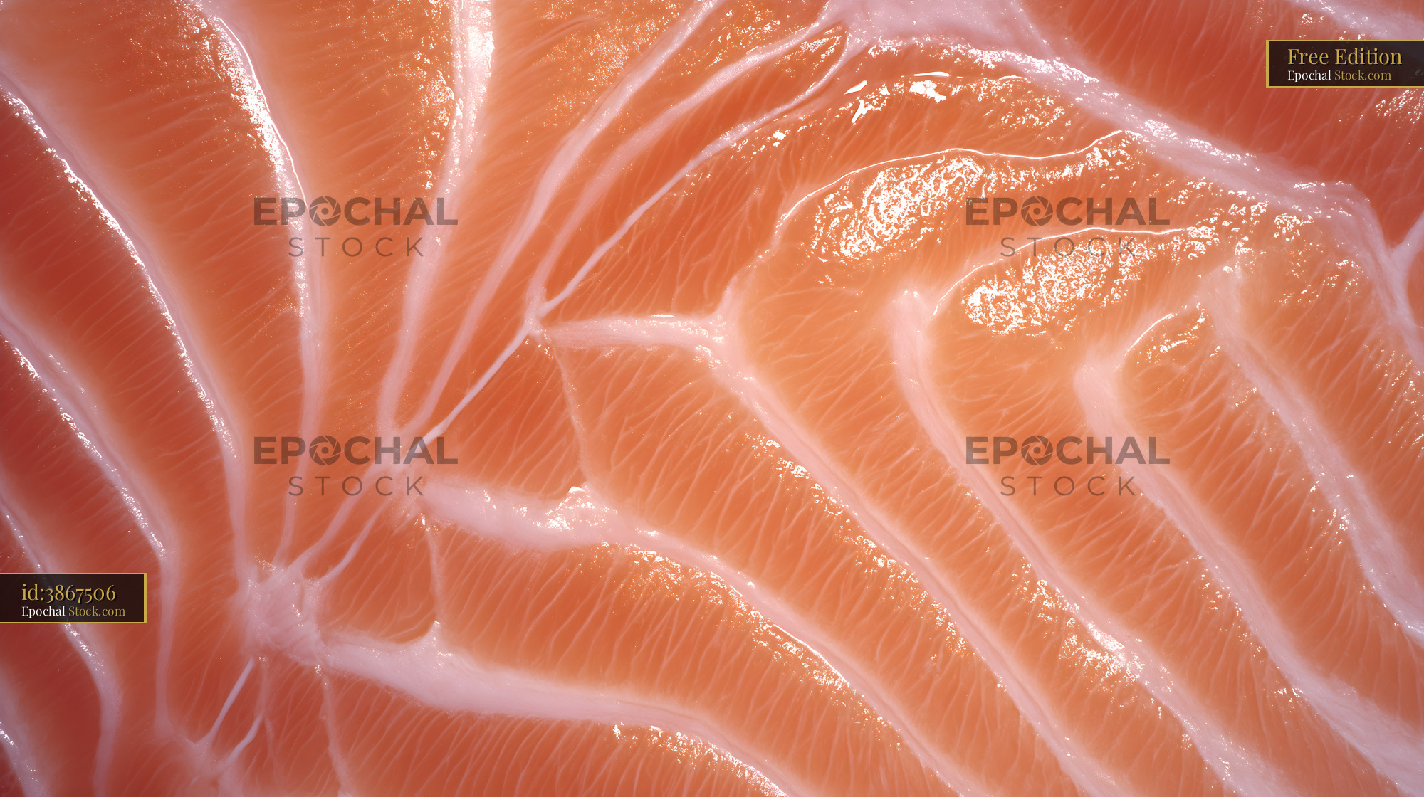 The picture displays a close-up view of fresh salmon fillet. The lines on the surface show the texture and color of the fish. This close view highlights the details of the salmon.