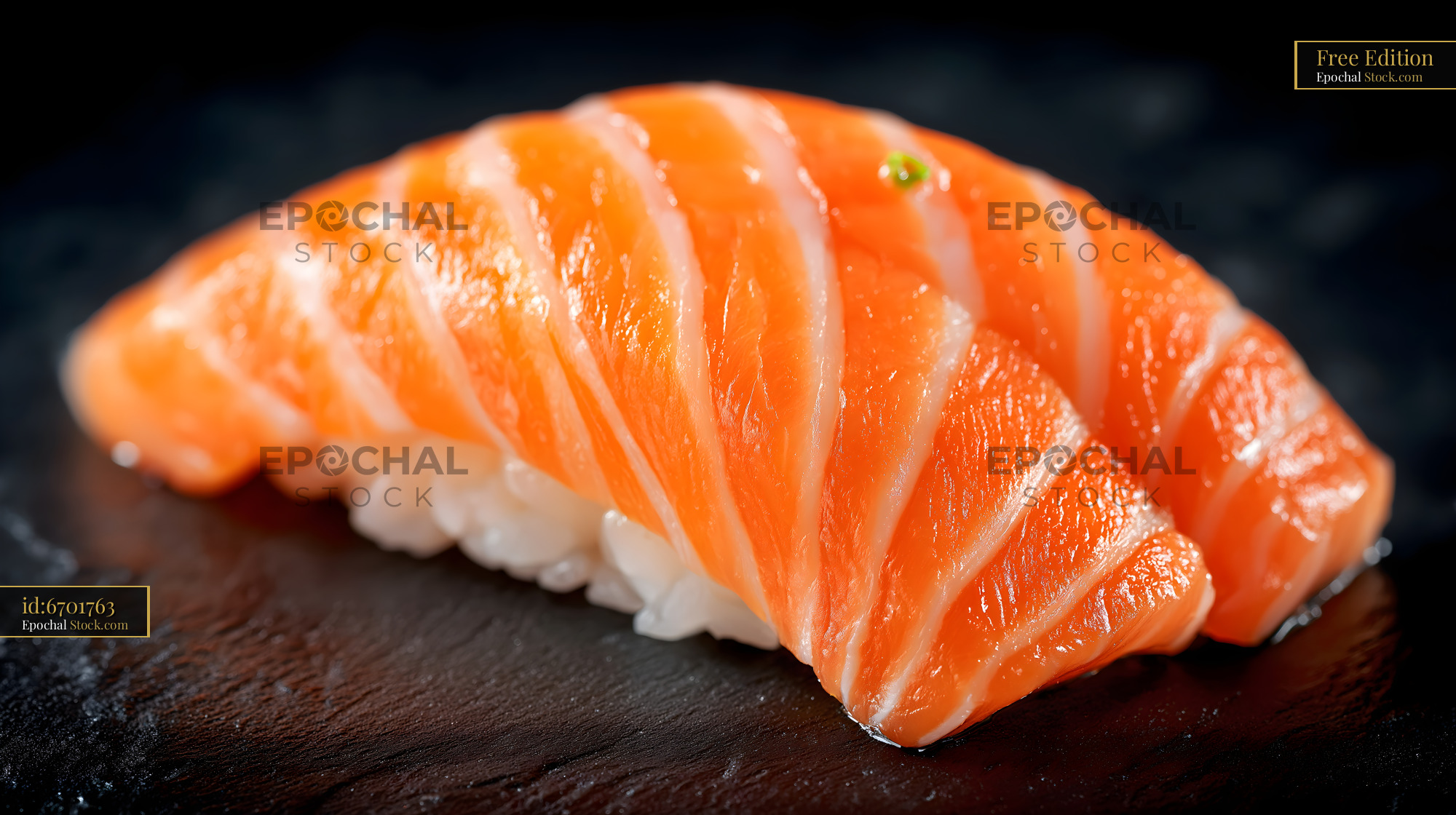 The dish features pieces of salmon sushi arranged neatly on a dark surface. It shows the delicate layers of the salmon on top of white rice.