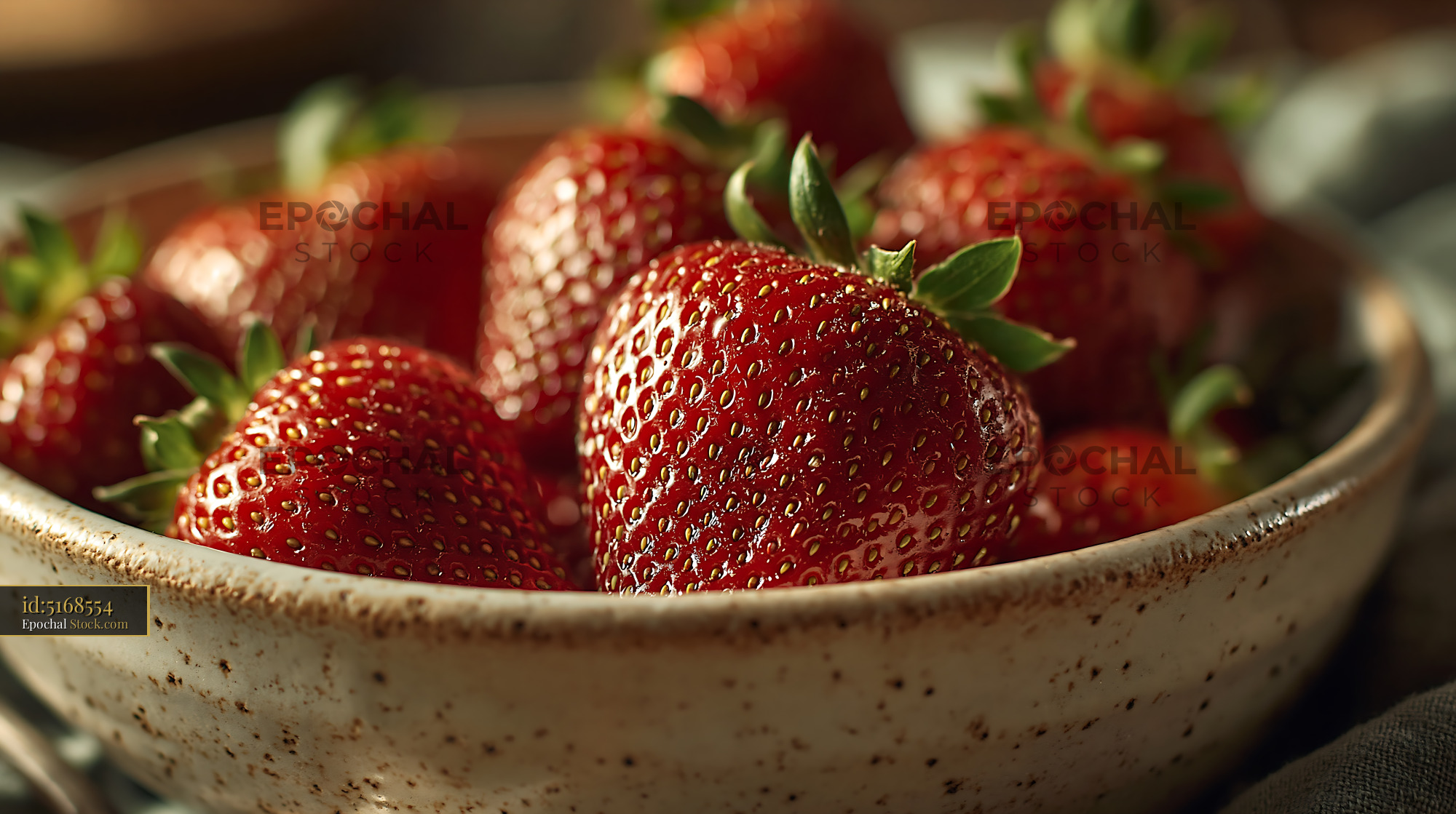 Fresh strawberries in a ceramic bowl at a summer garden party