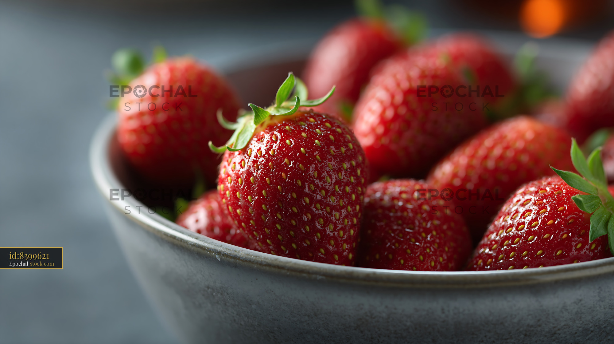 Fresh strawberries in a ceramic bowl with soft natural lighting