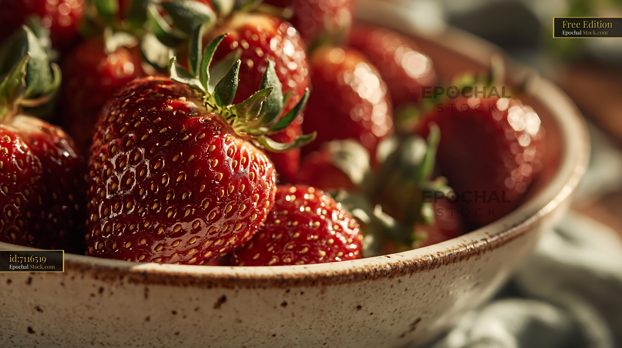 Ripe and juicy strawberries fill a rustic ceramic bowl, bathed in soft golden hour sunlight, evoking a sense of summer harvest, freshness, and healthy natural living.