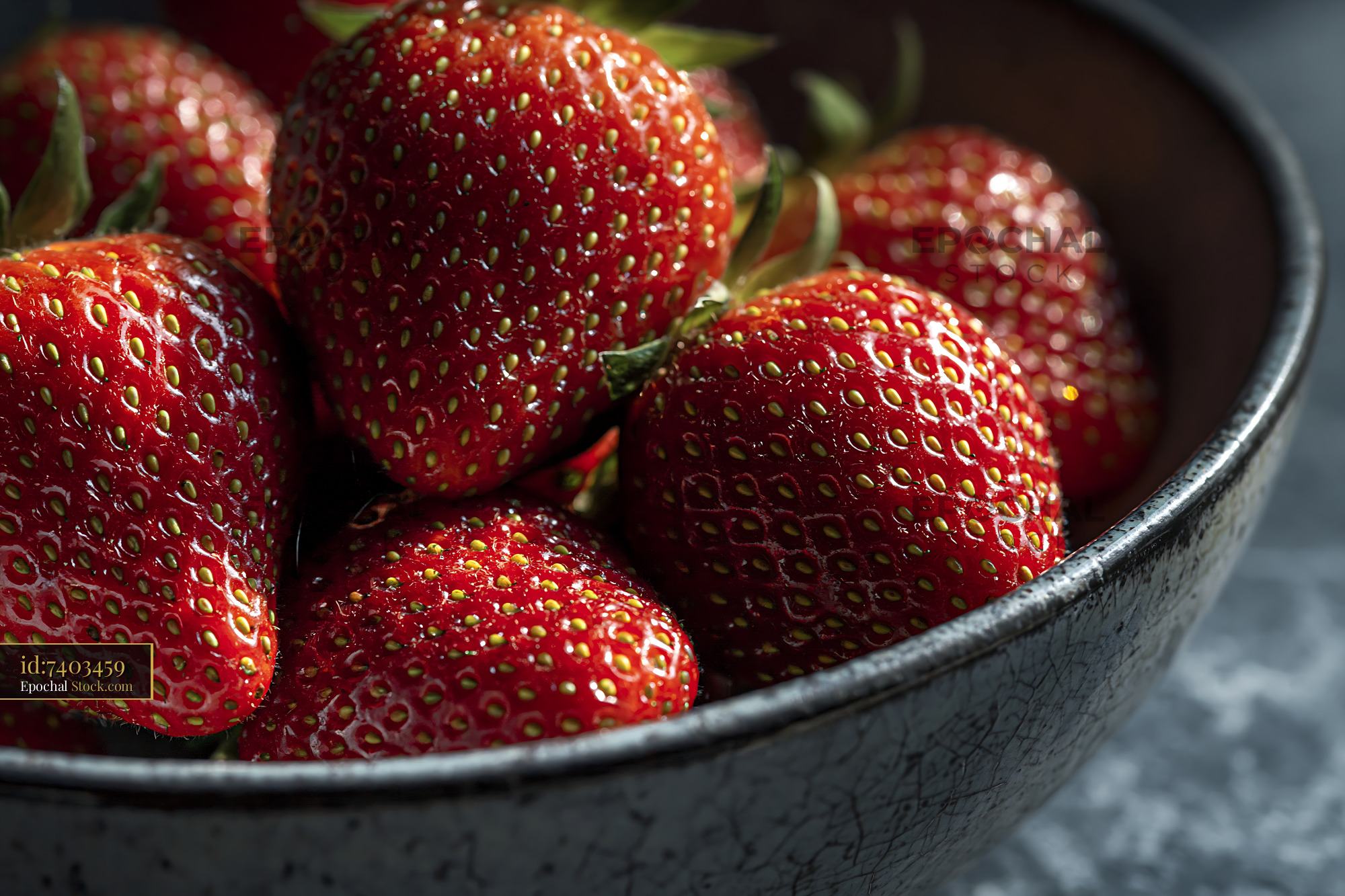 Fresh strawberries in a rustic ceramic bowl with dramatic lighting
