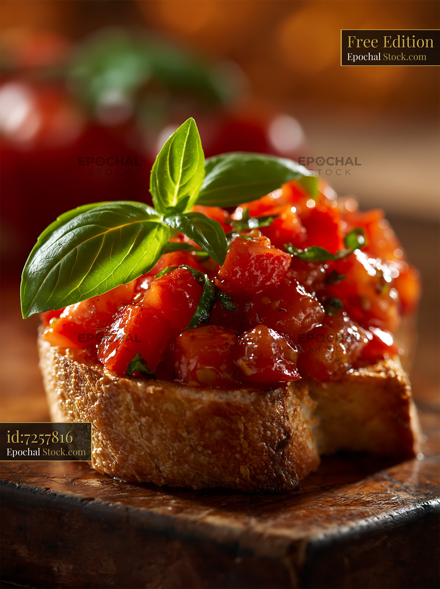 A close-up of a delicious Italian bruschetta topped with diced tomatoes and fresh basil leaves, capturing the essence of Mediterranean cuisine and culinary craftsmanship.