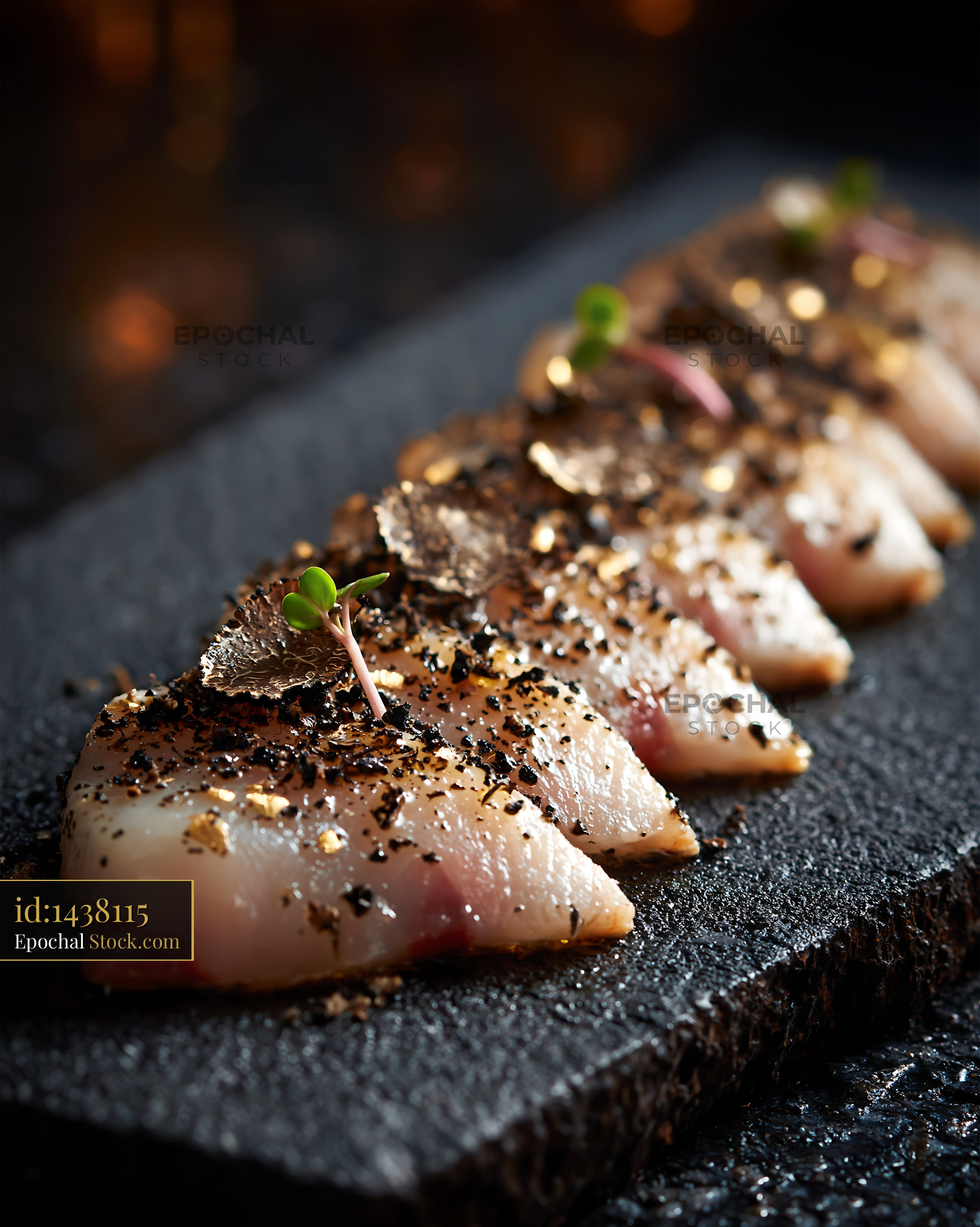 Exquisite yellowtail sashimi topped with black truffle and edible gold leaf, served on a dark stone plate, evoking a sense of luxury, culinary artistry, and fine dining excellence.