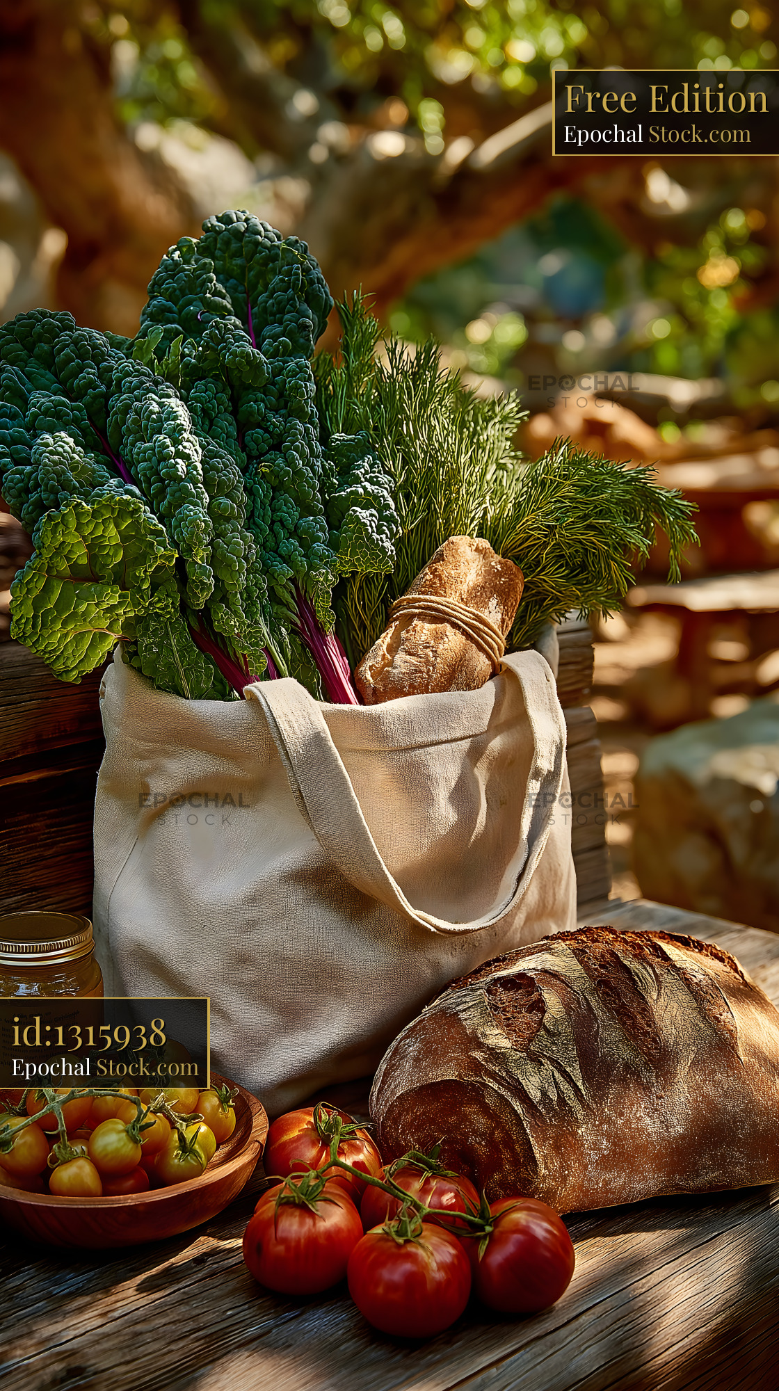 A bag filled with leafy greens and herbs rests on a wooden table. Nearby, a loaf of bread and a bowl of ripe tomatoes are displayed. This scene shows a connection to natural food and local farming.