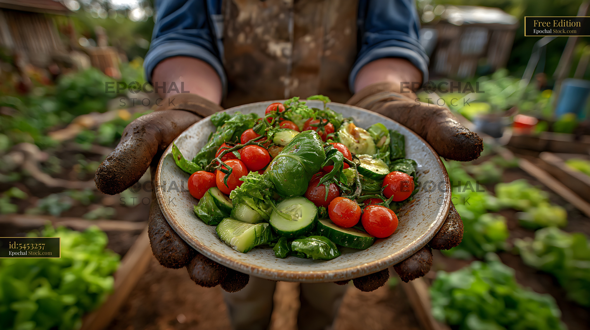 A person holds a plate filled with fresh vegetables. The scene is set in a garden with plants around. Sunlight shines on the produce, showing bright colors and healthy growth.