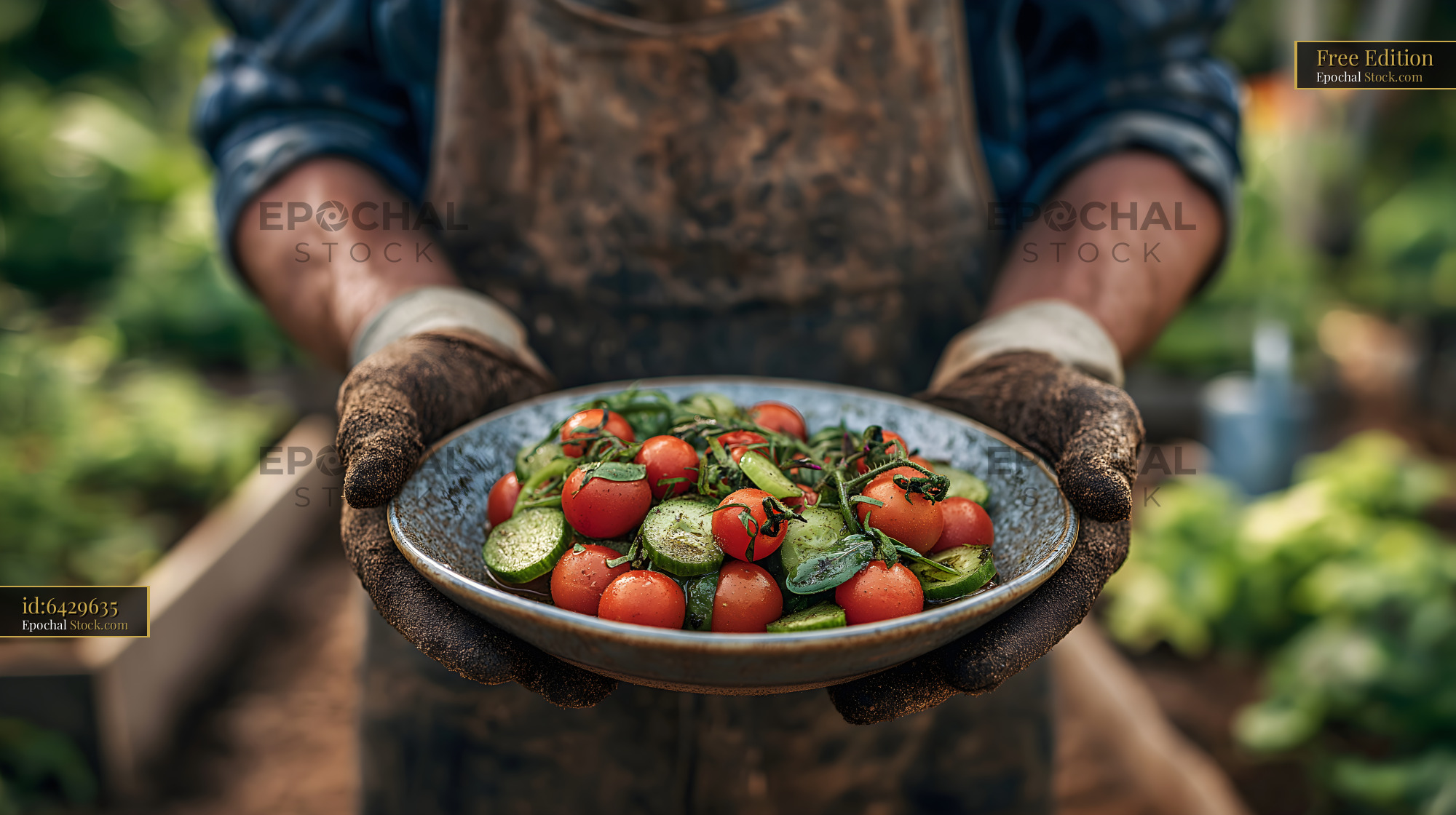 A gardener stands in a garden and holds a blue plate with fresh tomatoes and cucumbers. The gardener wears gloves and looks proud of the harvest. It is daytime in a sunny location.