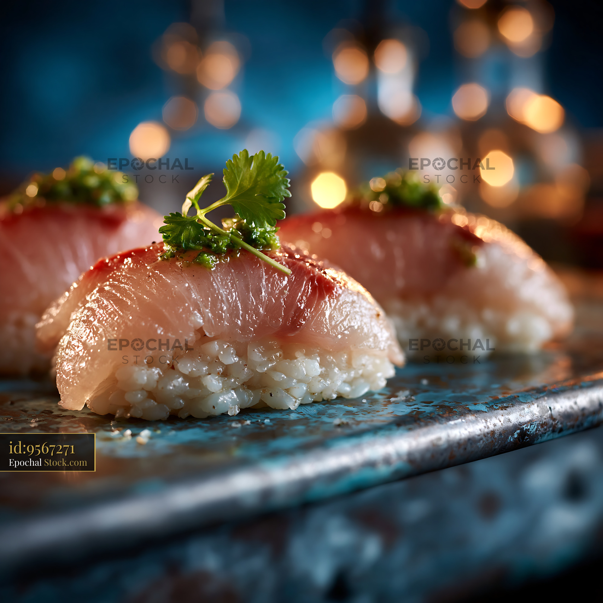 Fresh yuzu kosho yellowtail sushi nigiri on a textured blue plate