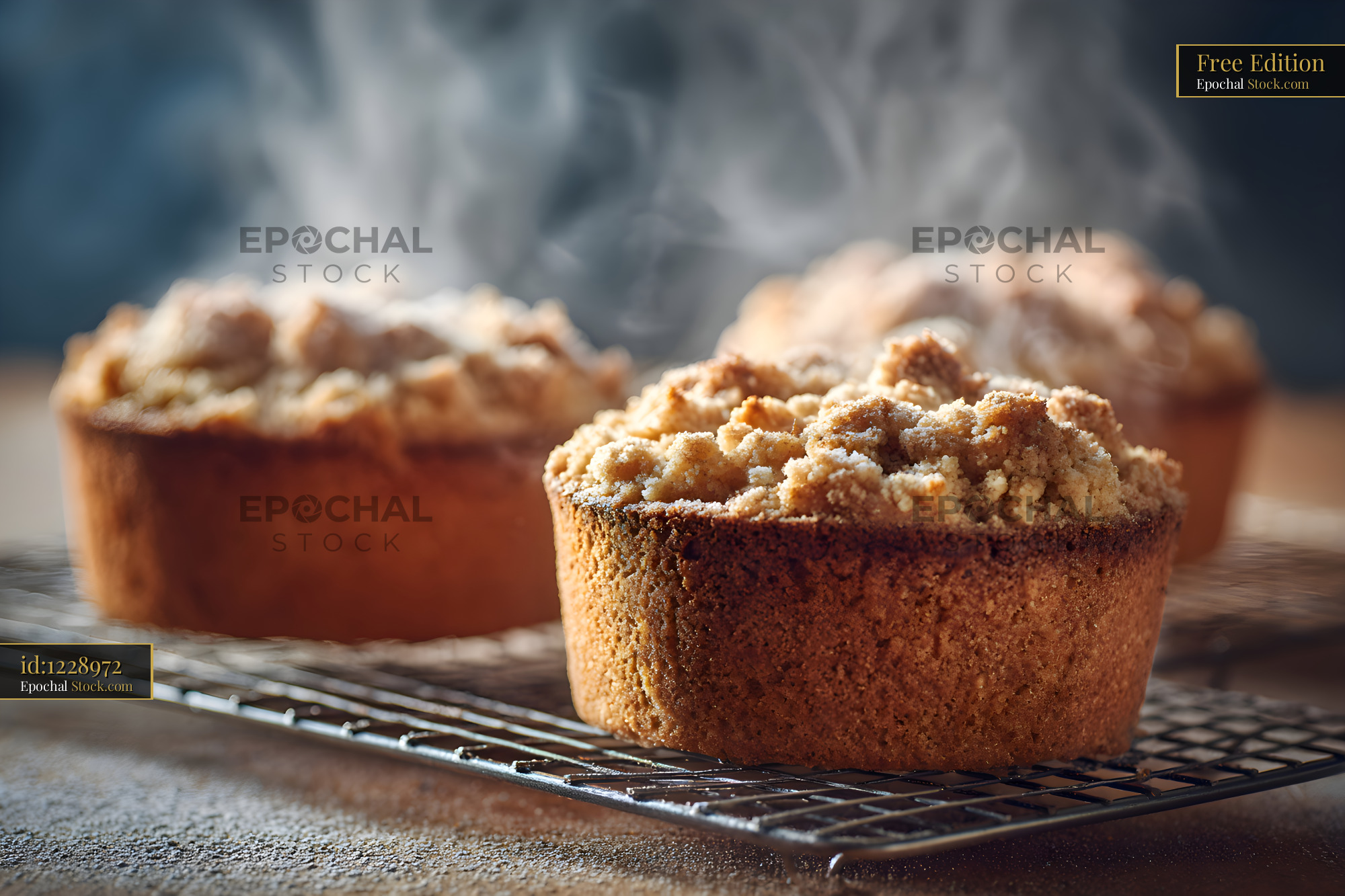 Cakes are placed on a wire rack in a kitchen. Steam rises from the warm cakes, showing they are fresh from the oven. The kitchen has a simple setting, with light shining on the cakes.