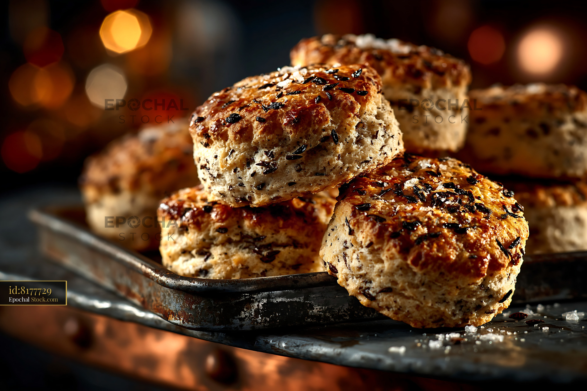 Golden caraway seed biscuits topped with sea salt on a vintage tray, evoking a sense of cozy homemade comfort and artisanal baking against a warm bokeh background.