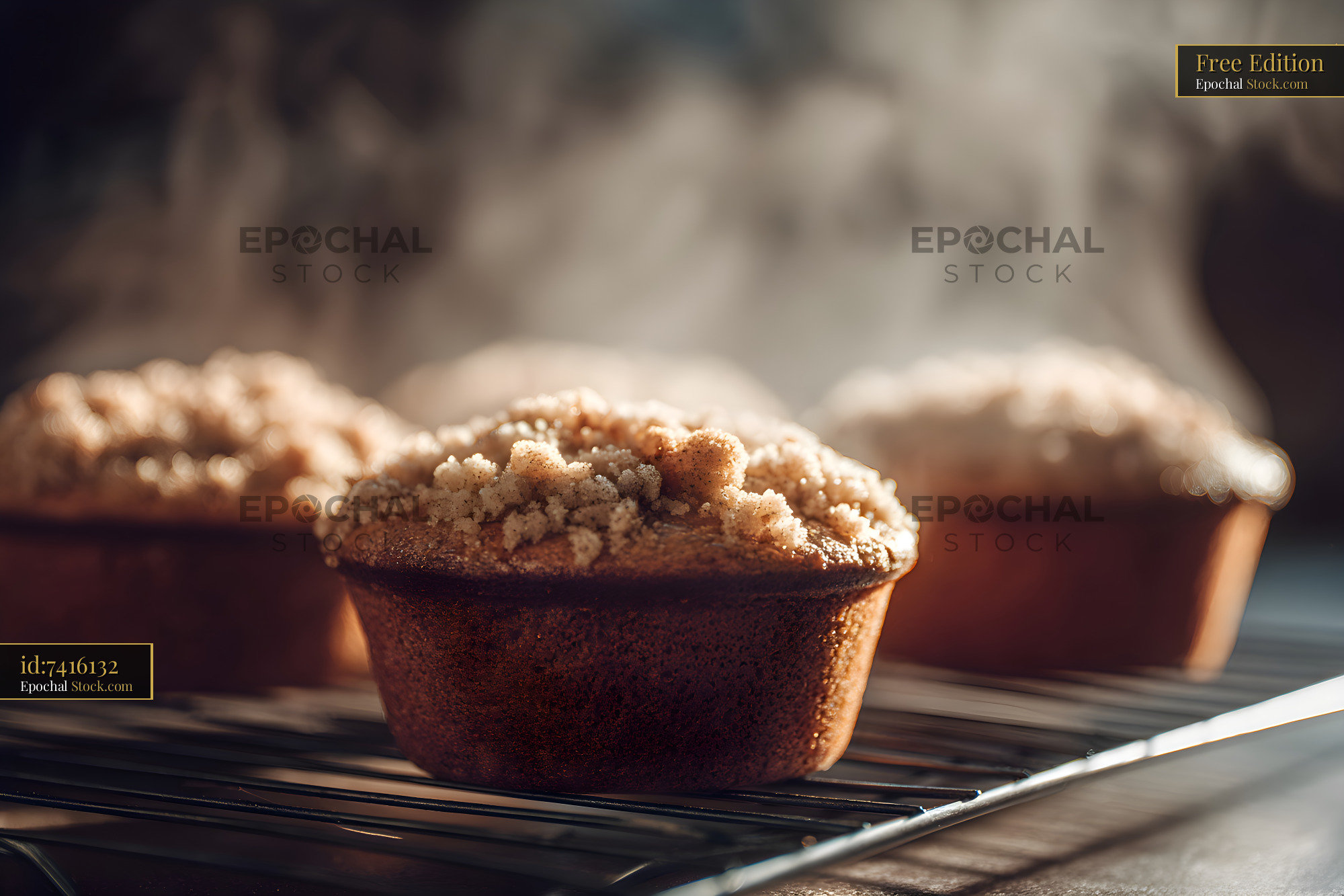Muffins sit on a wire rack in a warm kitchen. Steam rises from the freshly baked treats, hinting at their warmth. The aroma fills the space, making it inviting.