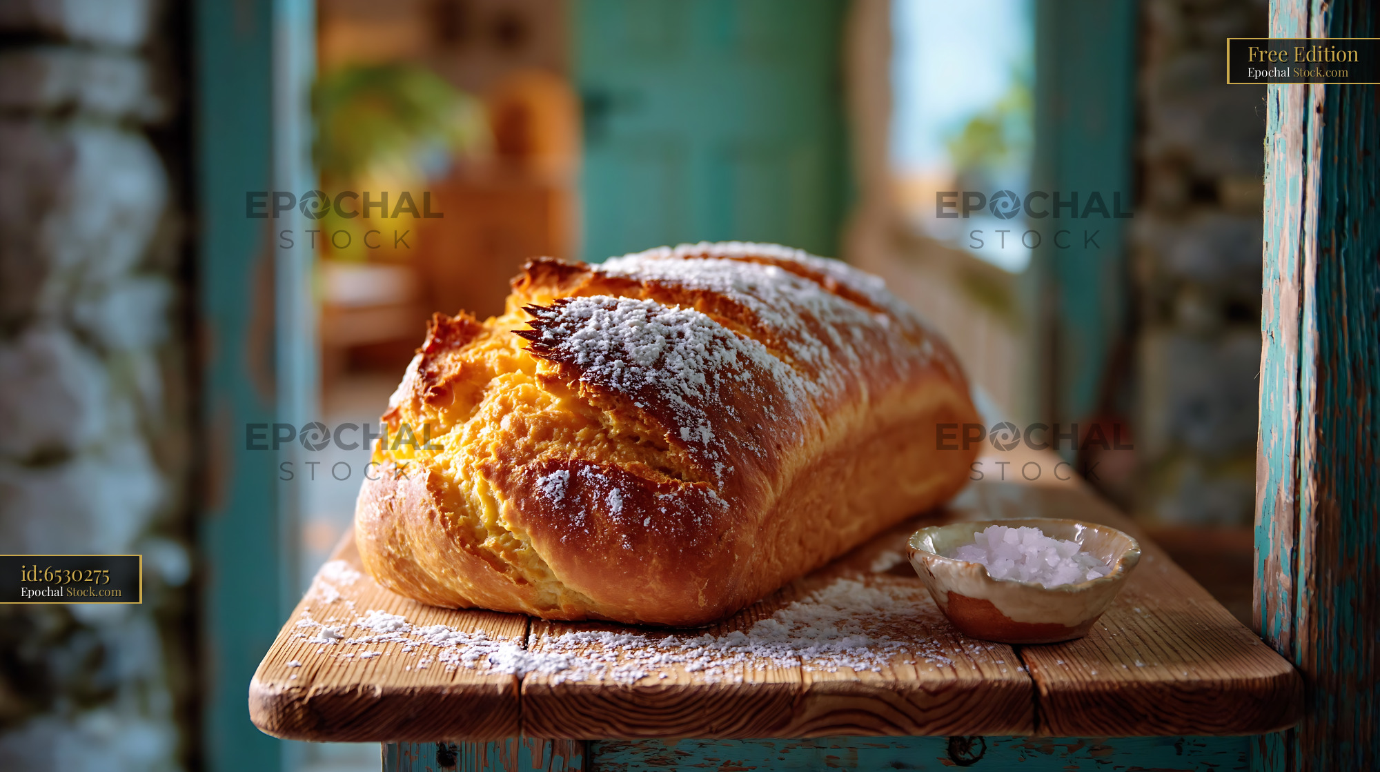 A golden loaf of traditional salt rising german bread sits on a weathered wooden table in a sunlit rustic kitchen, evoking a sense of heritage, warmth, and artisanal baking.