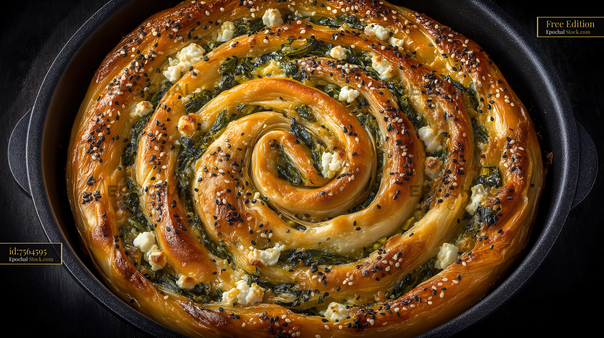 A round spiral bread filled with spinach and cheese. It is golden brown and topped with sesame seeds. The bread is placed in a black baking dish ready to serve.