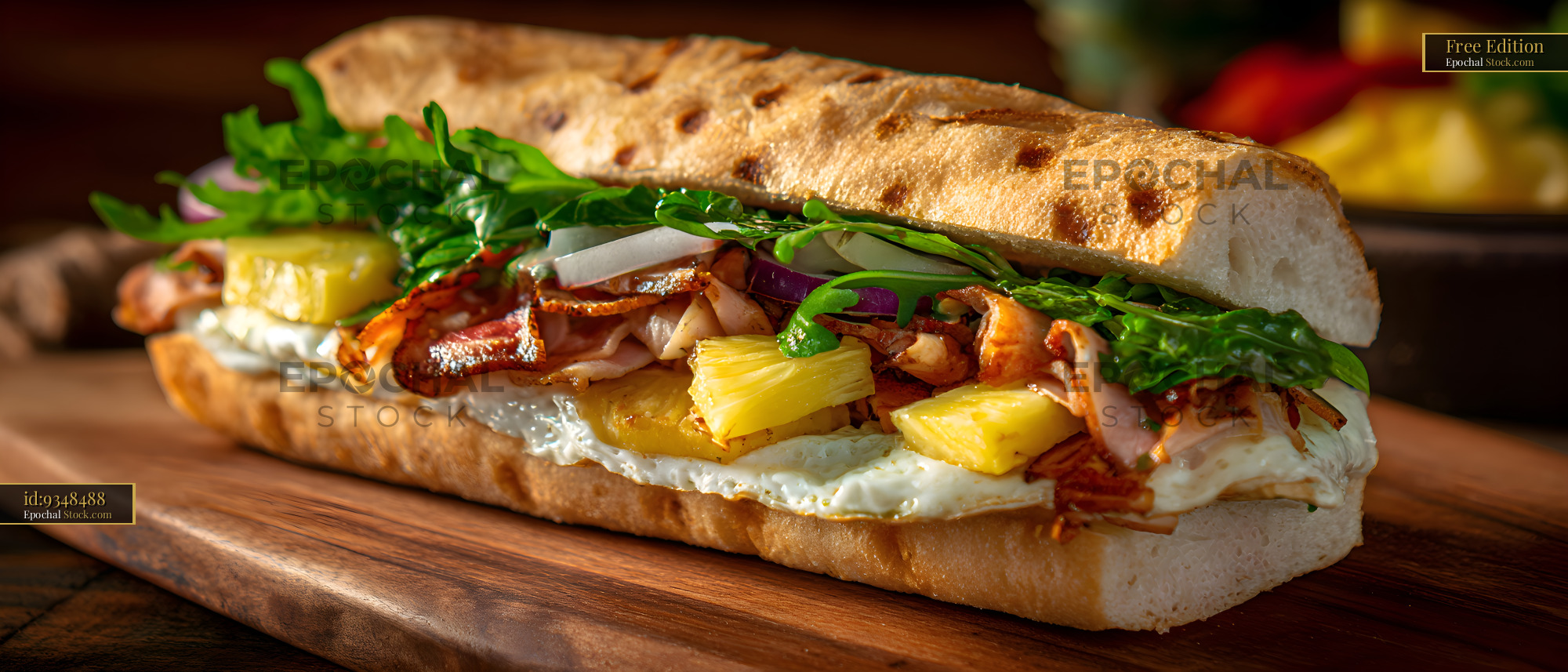 A long sandwich sits on a wooden cutting board. It has layers of meats, pineapple, onions, and greens. The setting shows a rustic kitchen with colorful vegetables in the background.