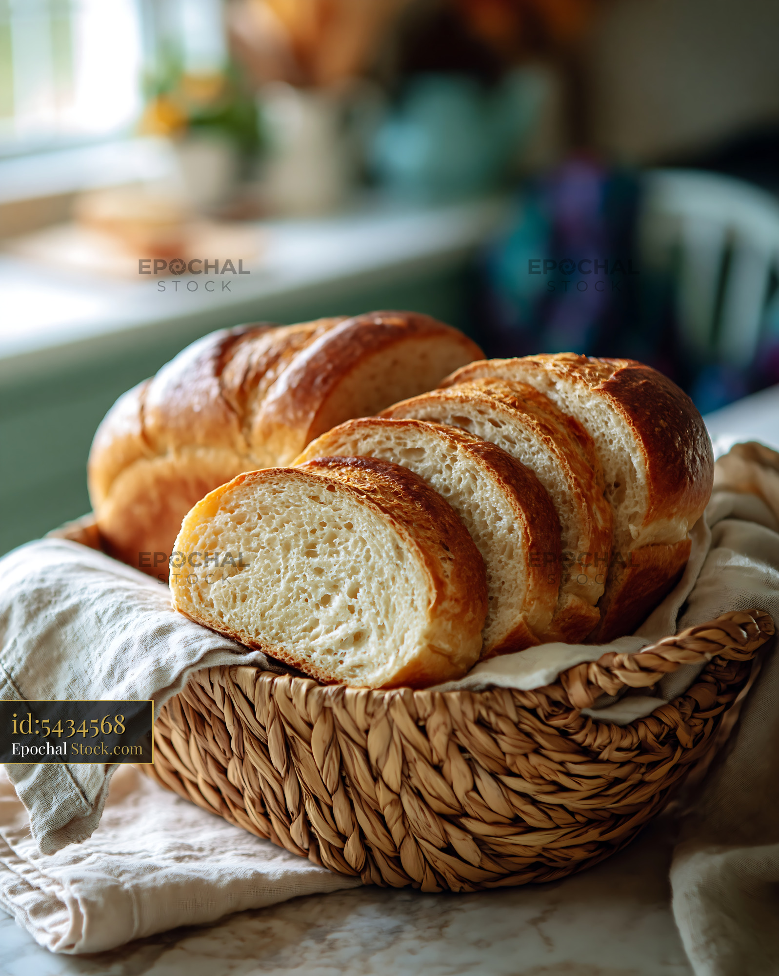 A warm loaf of freshly sliced artisan bread sits in a woven basket by a sunlit window, capturing the cozy atmosphere of a slow morning and home-baked comfort.