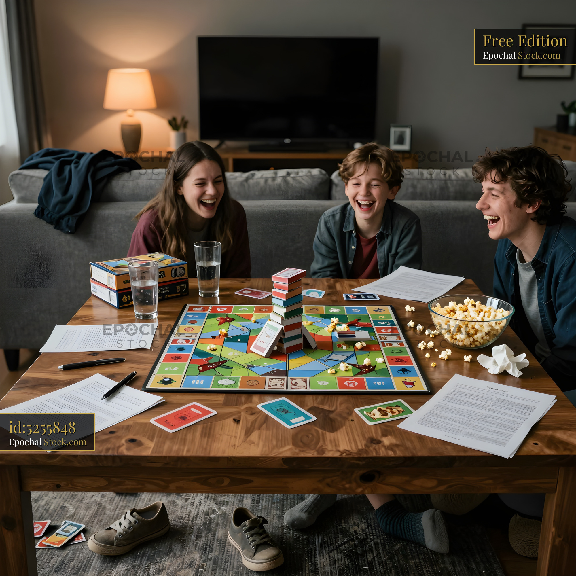 Three friends sit around a table laughing while playing board games at home. They have drinks and snacks on the table. The room is cozy and inviting.