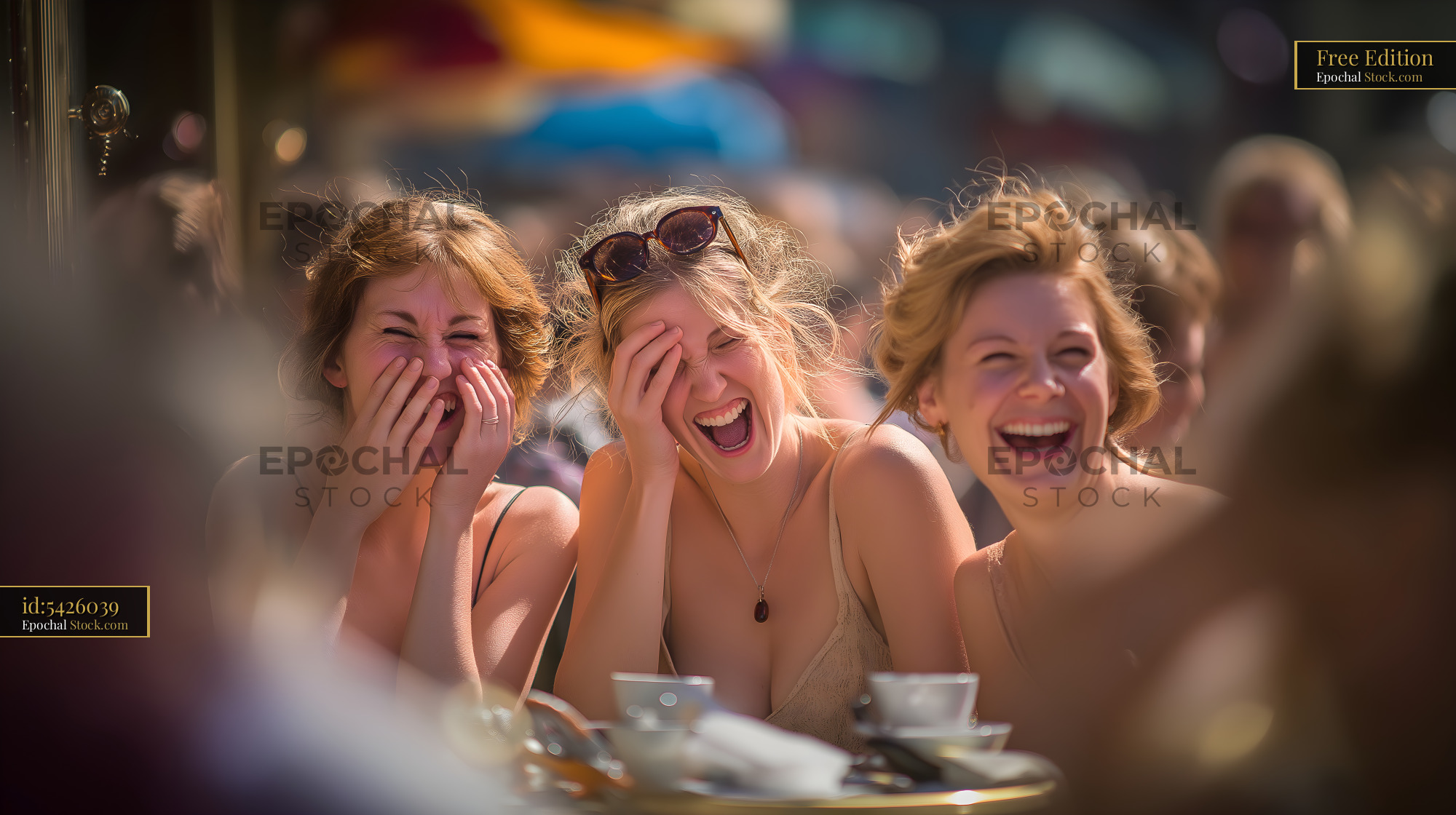 Three friends laugh and smile while sitting at a table in an outdoor cafe. They share a moment of joy among other patrons on a sunny day.