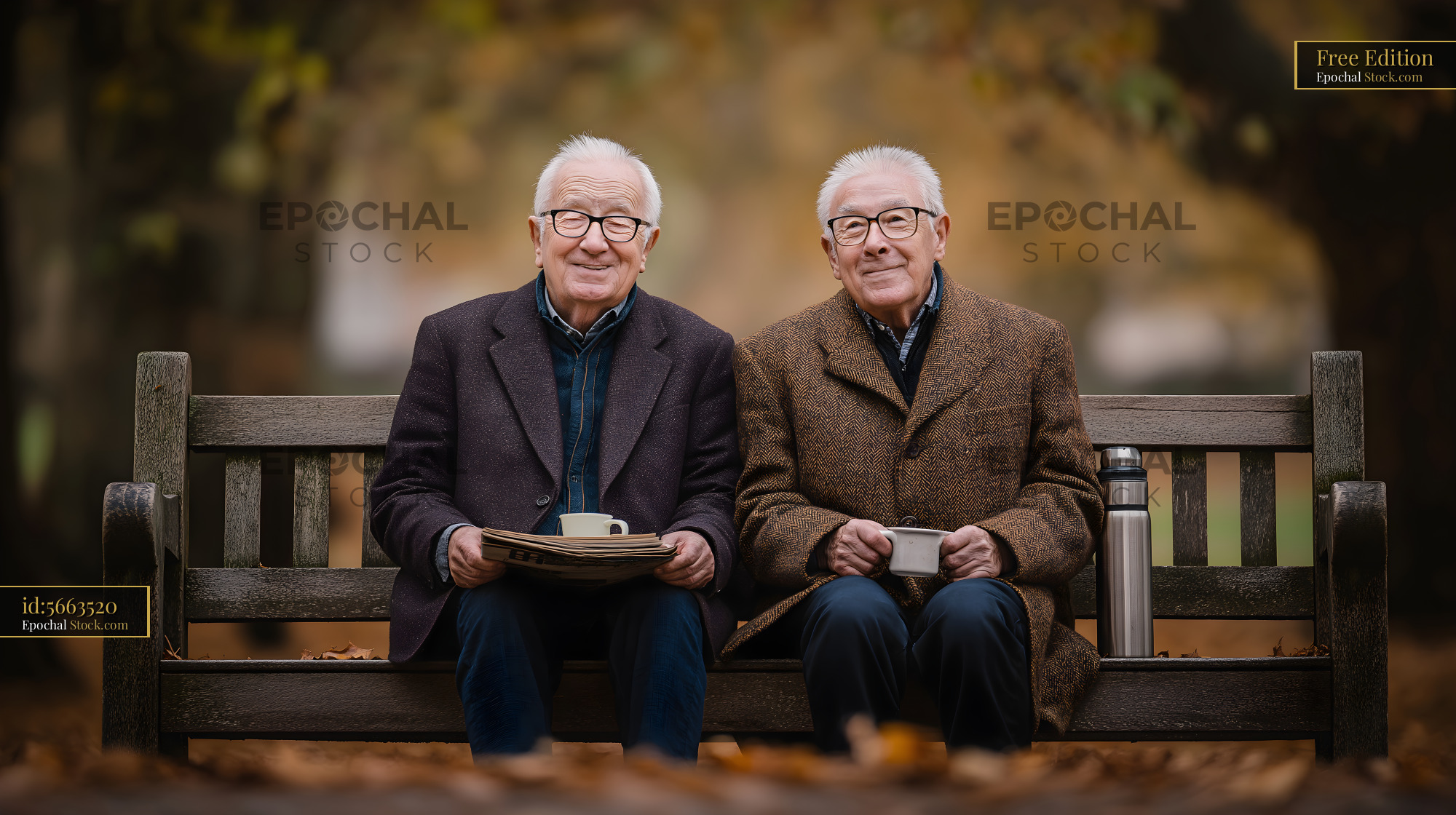 Two older men sit on a wooden bench in a park. They hold cups and share smiles while surrounded by autumn leaves and trees. They are enjoying a sunny day and each other's company.